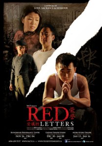 Red Letters will be playing until December 4 at the Roundhouse Performance Centre in Vancouver, after that, it moves to the Gateway Theatre Studio in Richmond from December 30 until January 8, 2011 with a Preview on December 29. You can also catch it at the Metro Studio Theatre in Victoria from January 13 – January 16 with a Preview January 12