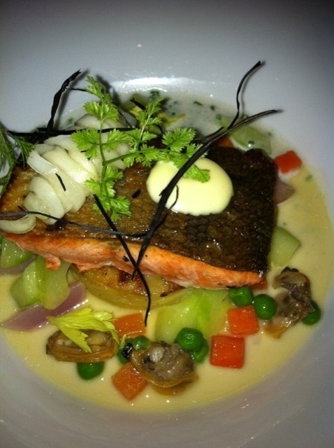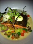For our main course we had the Yukon gold potato & leek cannelloni (slow roasted turnips, sherry brown butter reduction) and the pan roasted Fraser River sockeye salmon (olive oil poached potato press, peas, cucumbers, manila clam essence) The cannelloni came with a parmesan cheese garnish and it was so buttery – you can really taste the milder flavours of the potatoes, and the strong taste of the cheese and the turnips complimented the dish to perfection. The salmon? melt in your mouth and juicy.
