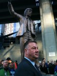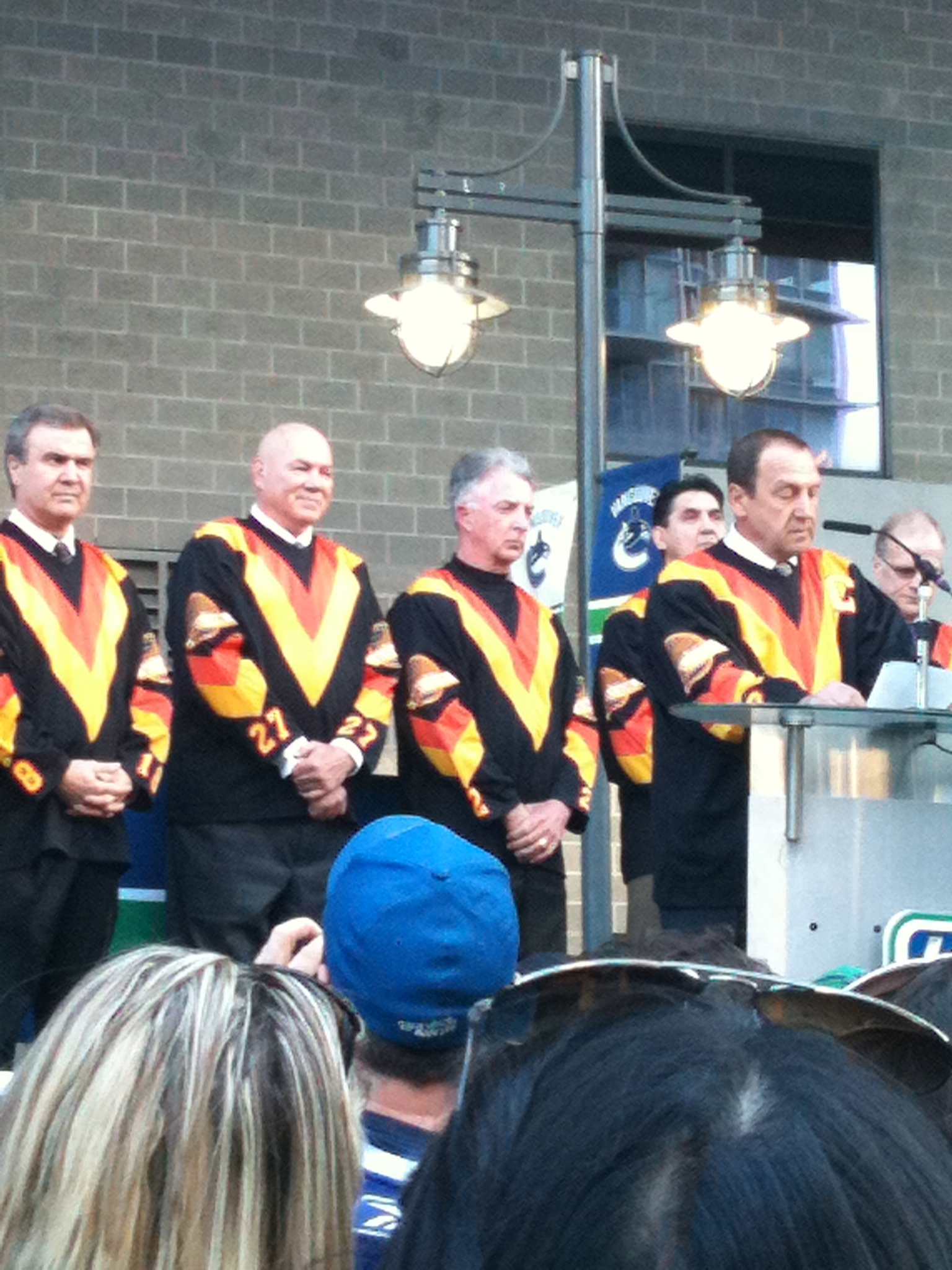 The statue features Neilson holding a hockey stick with a white towel draped at the end, immortalizing that very moment. There were many people in attendance, including some of the original team members of the 1982 team, including Darcy Rota Stan Smyl, Harold Snepsts, Tiger Williams and Thomas Gradin.