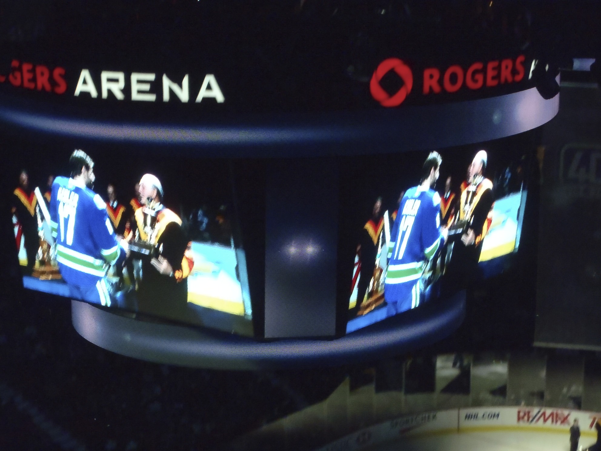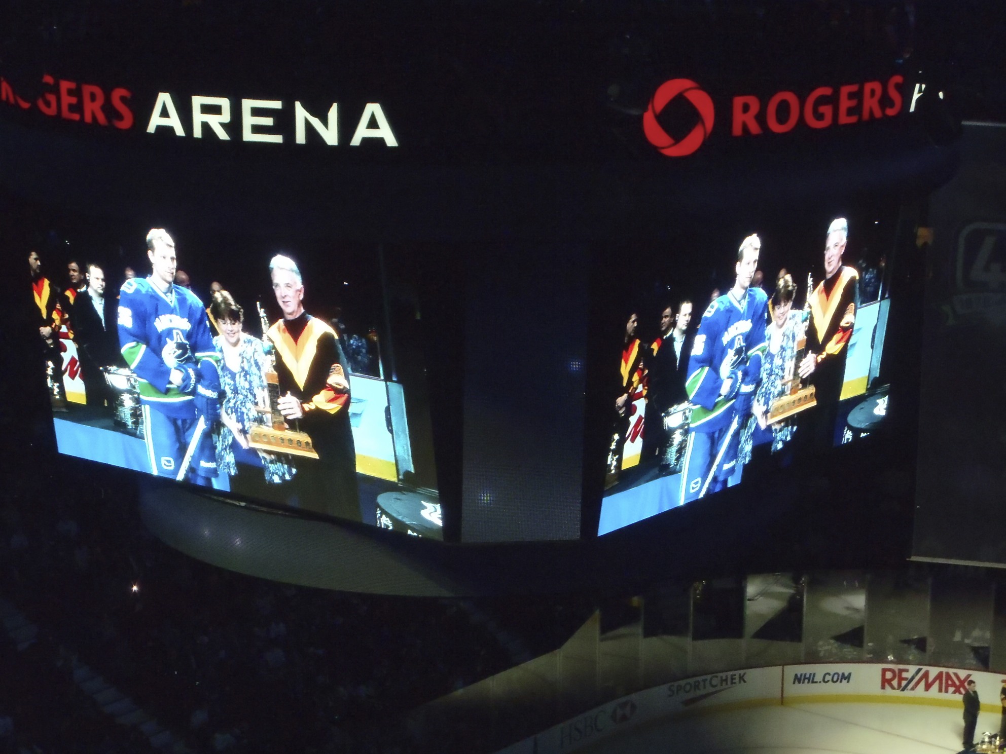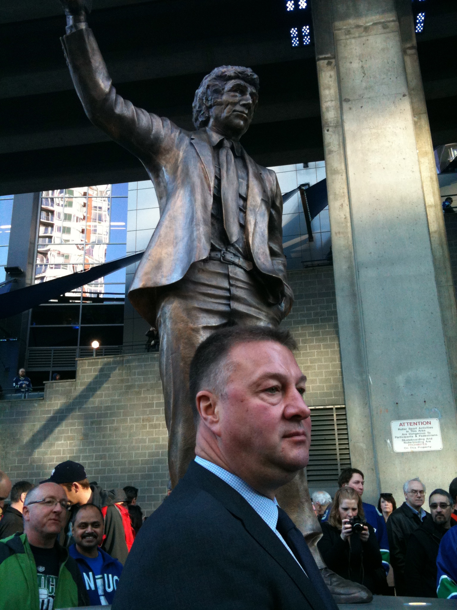 Tonight The Canucks hosted the Minnesota Wild for the last home game of the regular season. Before the game, The franchise unveiled a bronze sculpture of former Canucks head coach Roger Neilson. For those of you who are not familiar with the name, Neilson was a Canucks coach and the first one to use video tapes as a training tool, earning him the nickname “Captain Video”. During the 1982 playoffs, in a game against the Chicago Blackhawks, he felt his team was unfairly penalized on several occasions. Finally fed up, He took a white towel and held it up on a hockey stick, as if waving a white flag in surrender. At the next game, thousands of fans took white towels and waved them in the air, creating a playoff tradition. “Towel power” continues to this day.