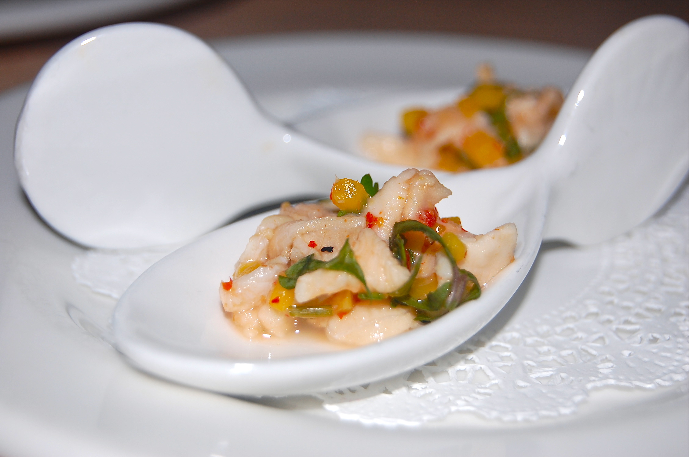 We started with a taste of the Cheviche with Scallops cooked in lemon. It was very good, the fish was flakey and the presentation was lovely.