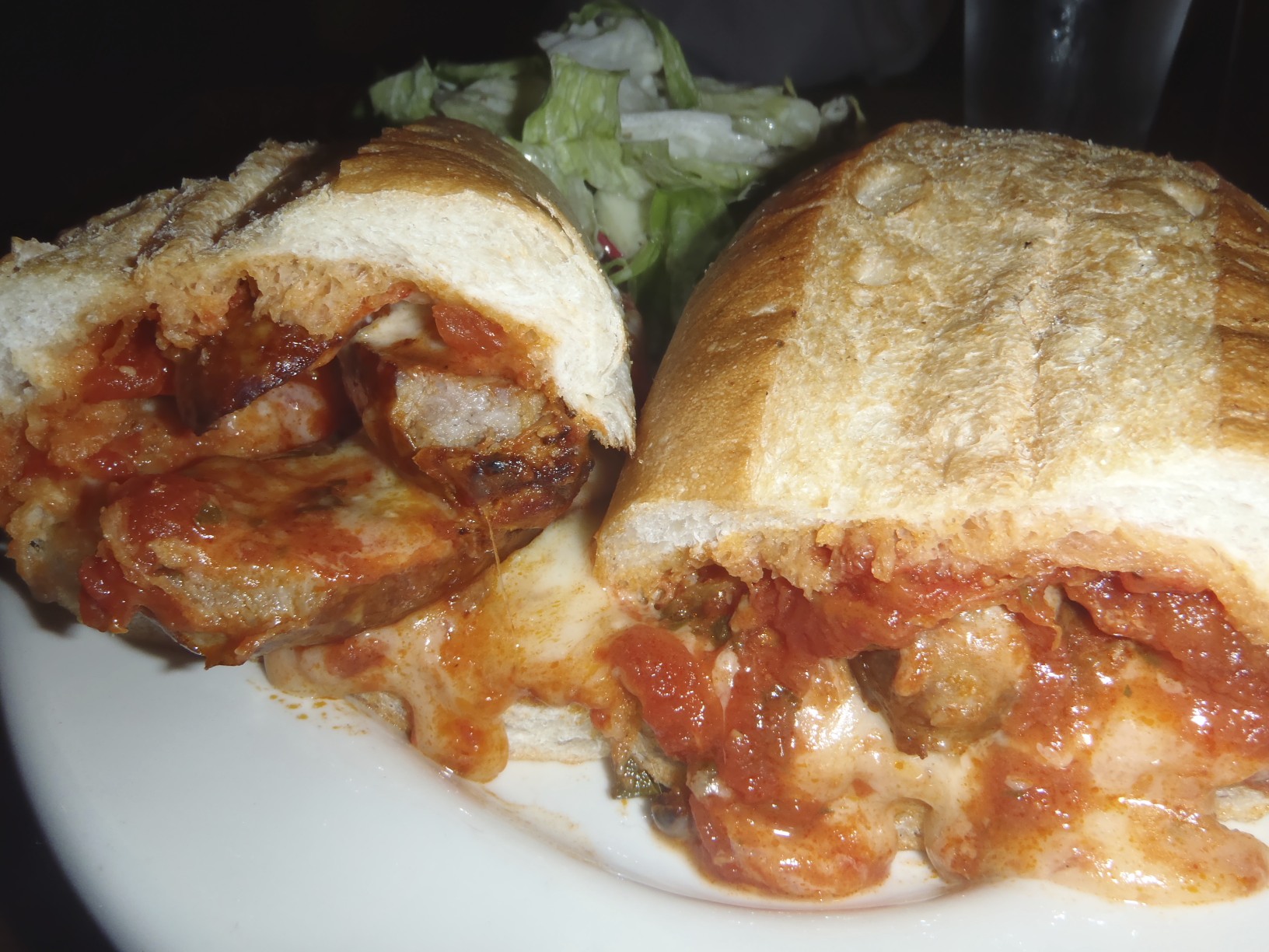 Being that I was on my own, I decided to sit at the bar. My server was amazing, so attentive and friendly, I felt that I was having lunch with a friend. He suggested that I order an item from the bar menu, so I chose the Sausage and Peppers Hero Sandwich (11.99) When that thing came, I couldn’t believe my eyes! It was huge! so massive, and for $11.99? crazy. I took a bite I was in love… spicy sausage with ripe, crispy peppers, covered in a delicious tomato sauce that was sweet and tangy at the same time. All of these ingredients where held together by the most gooey, melted mozzarella that you’ve ever tried. It was nothing less than expectacular. The bread? warm, crispy. There isn’t a single thing I would change about this sandwich. It was a master piece. It also came with a salad with romaine lettuce, tomatoes, cucumbers and green onions on a very tasty, creamy dressing.