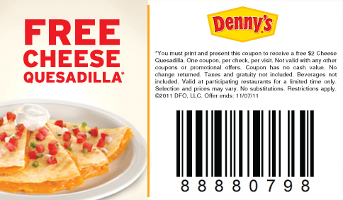 Now until November 7th, 2011, Denny’s is offering free cheese quesadillas with this coupon