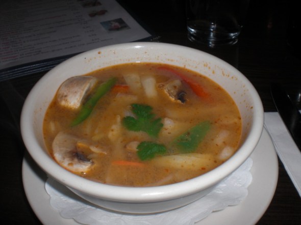 The atmosphere is inviting with dark woods for the furniture and warm reds and oranges for the walls, it’s a very cozy place. The service is so amazing. Usually handled by one host/server “Thai” who is on top of his duties. Never have to wait more than a few minutes for anything. Fantastic Thai Iced Tea & Coffee for $2.95 each and the best Lychee Thai Iced Tea this side of the Hudson also for $2.95 filled with real Lychee’s. I was flying solo tonight and had a healthy appetite to boot. I started out with Tom Yum Goong (Shrimp Lemongrass Soup) – Traditional shrimp soup in lemongrass, mushrooms, onion, chili, lime juice & kaffir lime leaves, this dish is filled with so much flavor a wonderful blend of delicate and pungent all at the same time for $4.95.