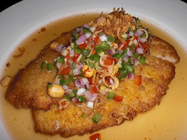 I then moved on to The Mixed Appetizer #5 which included – 2 Chicken Satay, 2 curry puffs, 2 Shrimp Rolls, 2 Spring Rolls, it was a nice way to taste a little bit of everything for $12.95. This appetizer comes with a trio of dipping sauces one better than the other. For dinner I had the Chicken Breast Tempura, you can choose 3 different ways to have this made, either with Pineapple Green Curry, Lemongrass or Sweet & Sour for $12.95. I chose Lemongrass with peanut, shallot, chili, ginger bell pepper & lime juice and it was delicious with two big chicken breasts full of flavor. For dessert I had the Black Sticky Rice with warm coconut milk for $4.50. And let me tell you this is a MUST have each and every time you visit. It’s served warm and so full of different textures, smooth warm coconut milk, grainy black rice and the smooth palm seeds blend so nicely. I have had and would highly recommend the Crispy Fillet Tilapia which you can order with Lemongrass or Chili Sauce for $13.95.