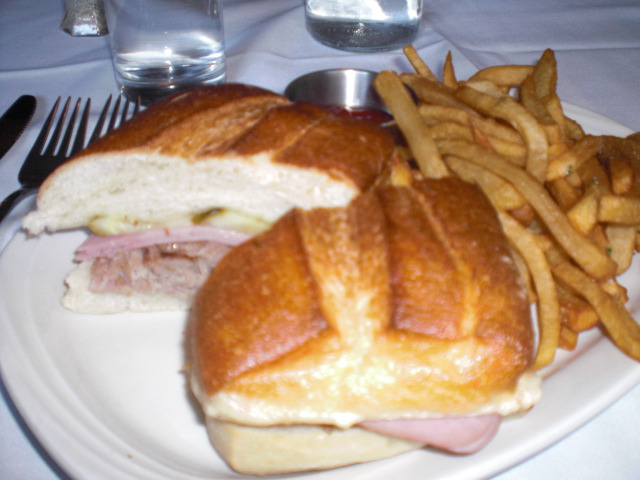 We went for lunch and were treated like gold. The wait staff was very attentive to our every need. We all opted for their great Prix Fixe Menu for $12.00. The Prix Fixe Lunch Menu comes with First Course and a Second Course. I had the Soup Du Jour – which was a very tasteful Split Pea along with the Cubano Sandwich – Pulled pork, sliced ham, swiss cheese, pickles, hand cut fries. One of my dinning partners started with the Ceasar Salad – Chopped organic romaine, anchovy, pecorino, croutons along with the Sliced Steak Sandwich – Grilled skirt steak, sautéed mushrooms, sautéed onion, mozzarella, hand cut fries. My third friend had the Baby Green Salad – Cherry tomatoes, cucumbers, red onion, lemon vinaigrette along with the Seared Tuna Sandwich – Homemade tartar sauce, hand cut fries.