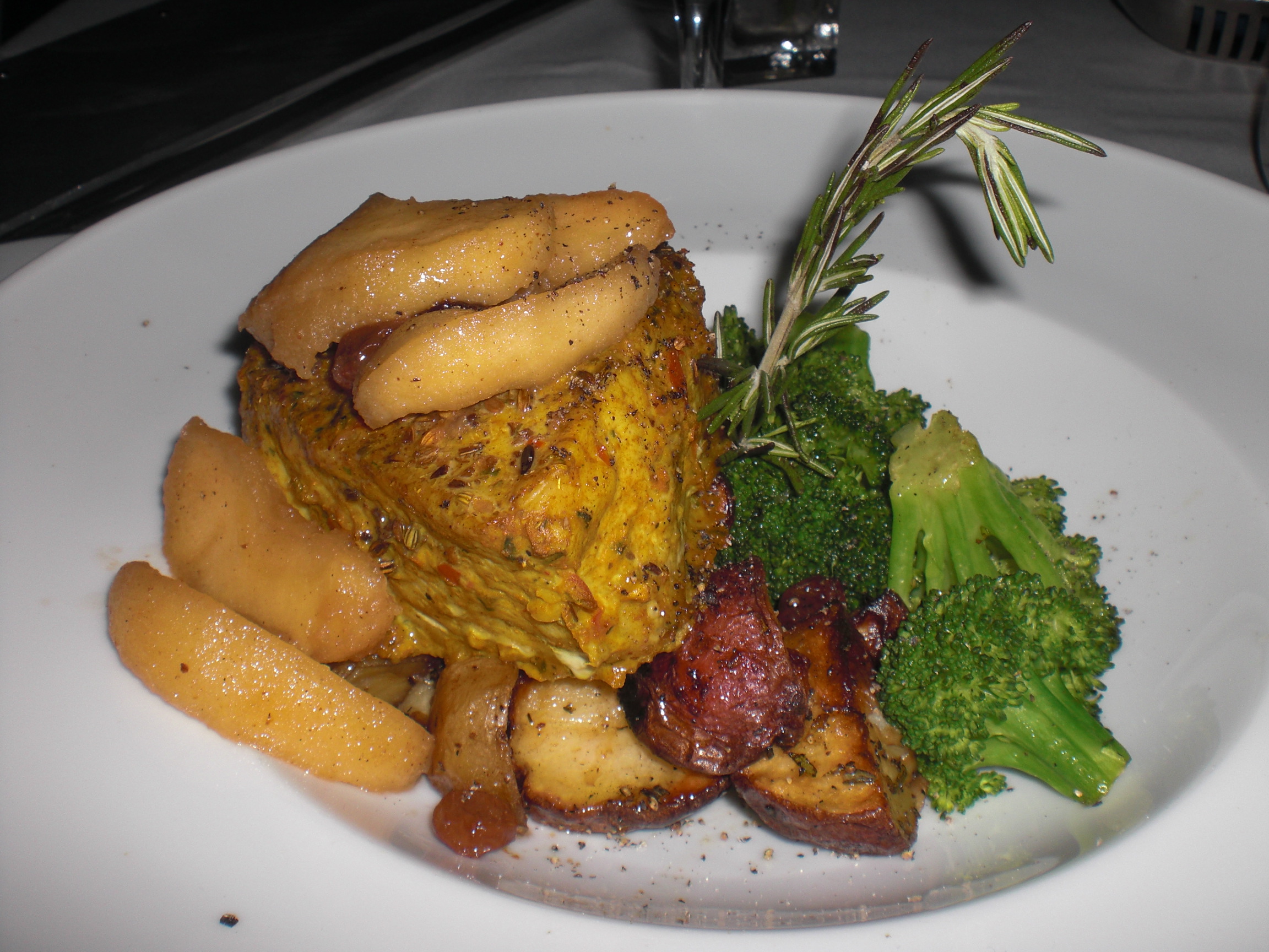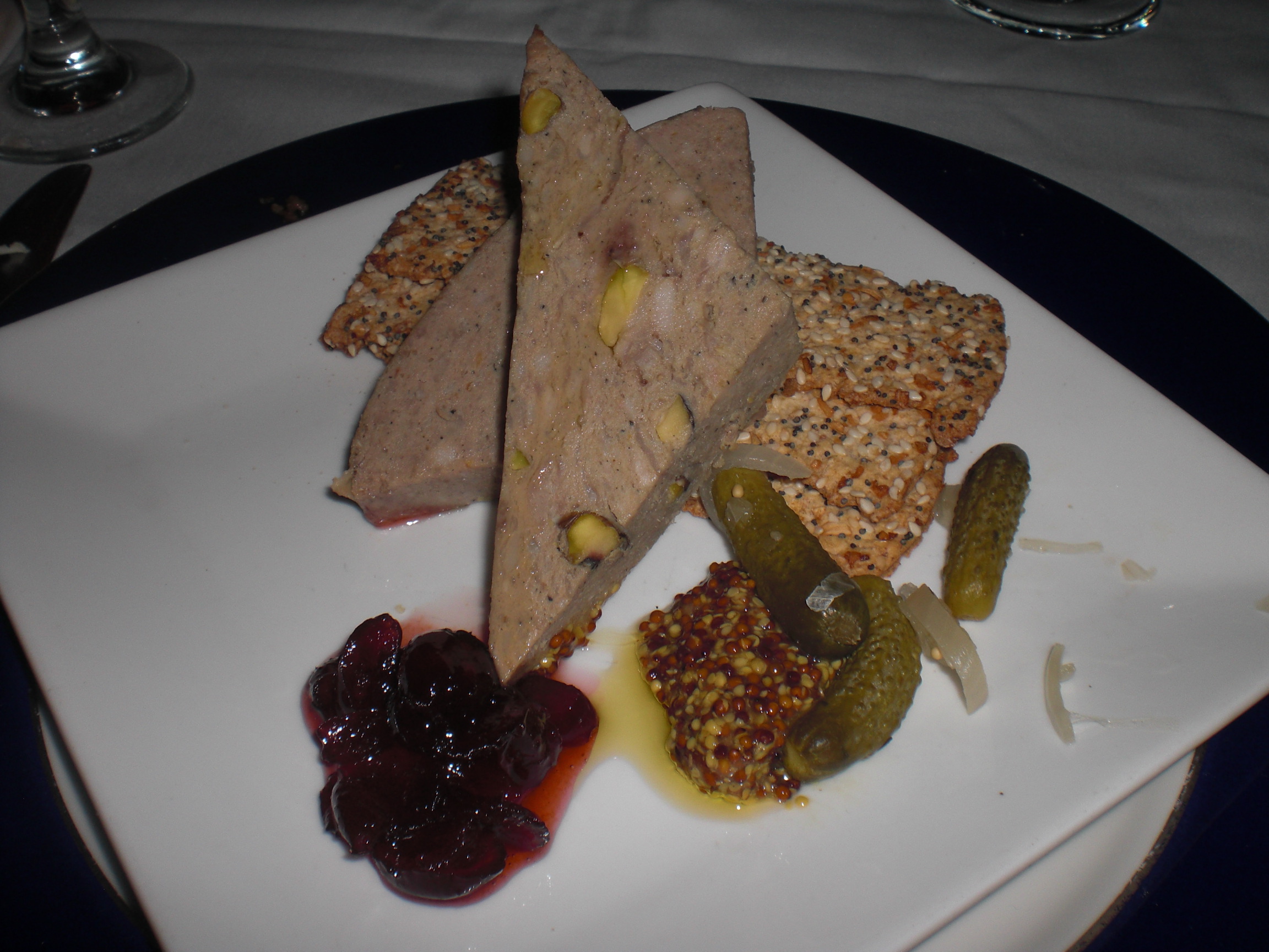 We started with a Citrus Splash Drink for $3.50 it was a great way to start off the cruise if you are not looking for an alcoholic beverage. We were first served Ratatouille that was to die for, a classic dish prepared just as it is suppose to be. As an appetizer I had the Shrimp & Corn Chowder – Roasted Sweet Corn, Gulf Shrimp, Red Pepper and Potato with Fresh Cream. It was served piping hot and full of Shrimp & Potato, it was very fulling. My dining partner had the Pate De Canard – Classic Duck Pate with Cornichons, Grainy Mustard and Toast Points. The Pate was plentiful, and was more loafish then spreadable but worked nicely with the crackers and accompaniment.