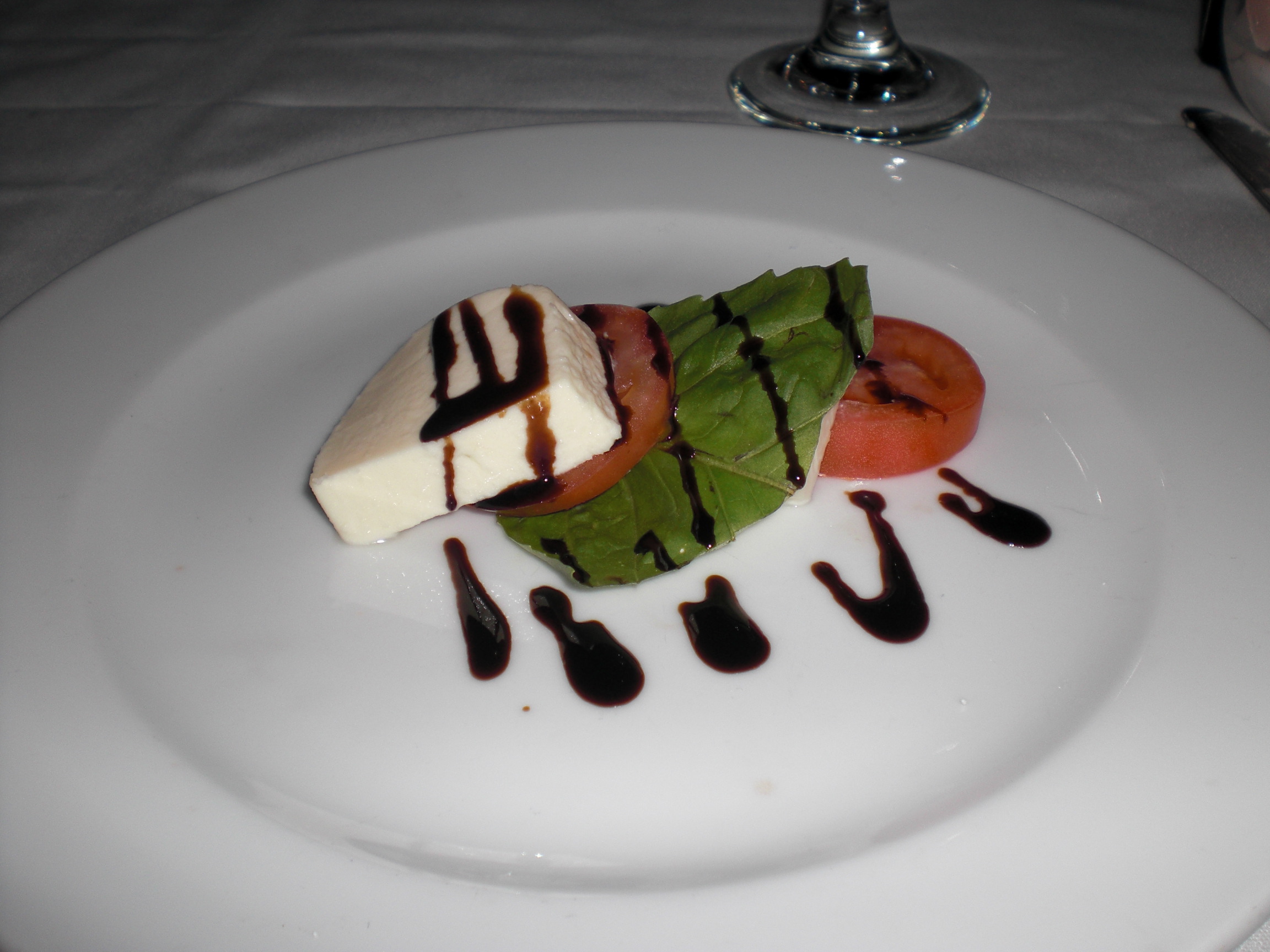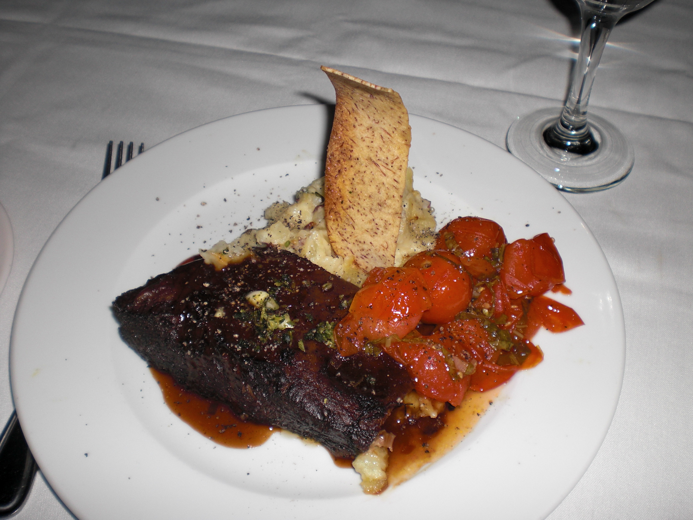 As an Intermezzo the chef prepared a Fresh Tomato, Basil and Mozzarella with a balsamic reduction and it was tasty. For dinner I had the Fennel and Coriander Crusted Pork Loin – With caramelized Granny Smith Apples and roasted RosemaryYukon Gold Potatoes. It was exquisite! My dining partner had the Beef Short Ribs – Syrah Braised Short Ribs with Red Skinned Smashed Potatoes, Seasonal Vegetables and Gremolata. It was off the bone and delicious. Portions were just right. This dinner came with unlimited rolls, Coffee, Tea & Sweetened Ice Tea.
