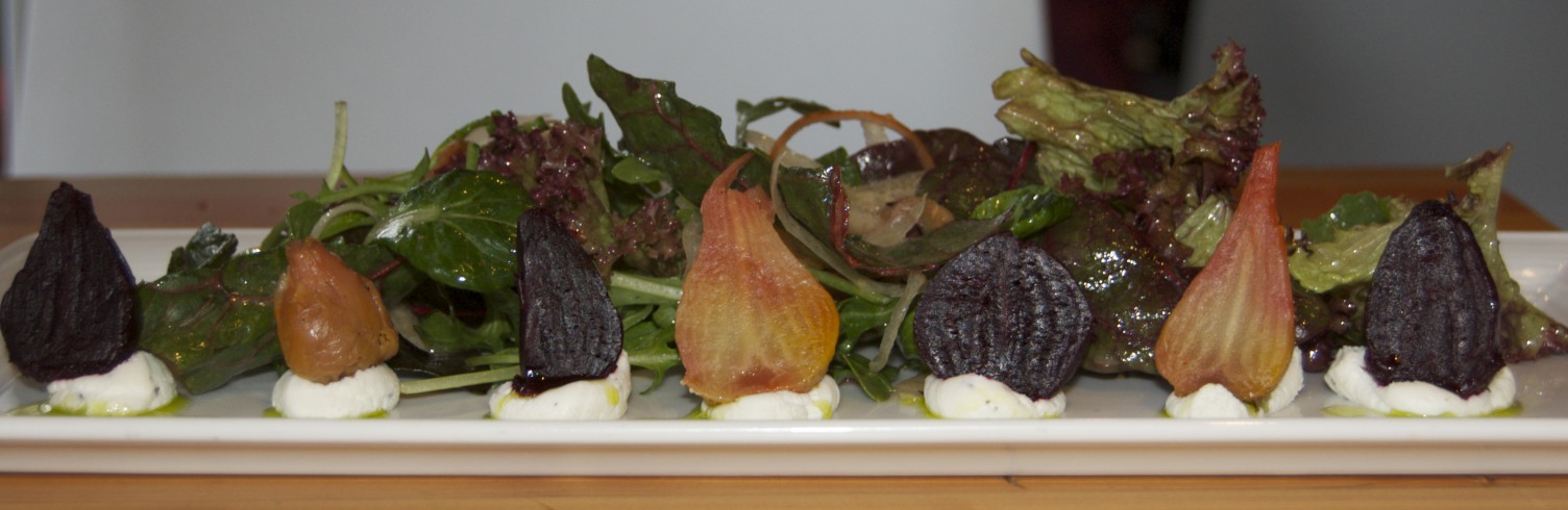 My very pretty salad came with mustard greens, whipped goat cheese from the Fraser Valley, and just a tad of olive oil. It was decadent.