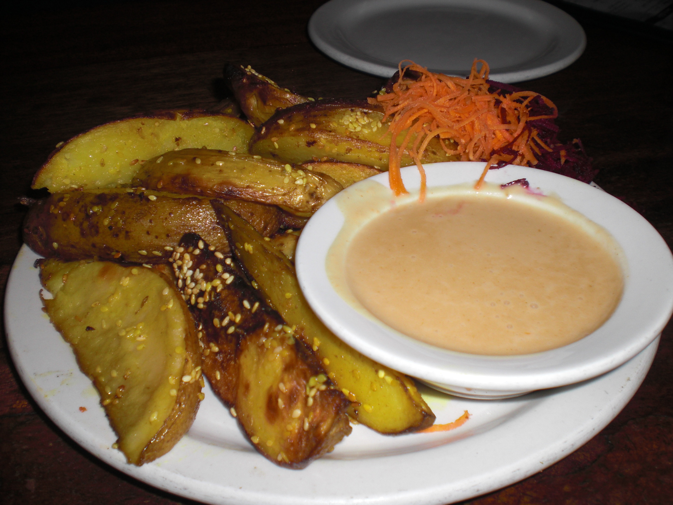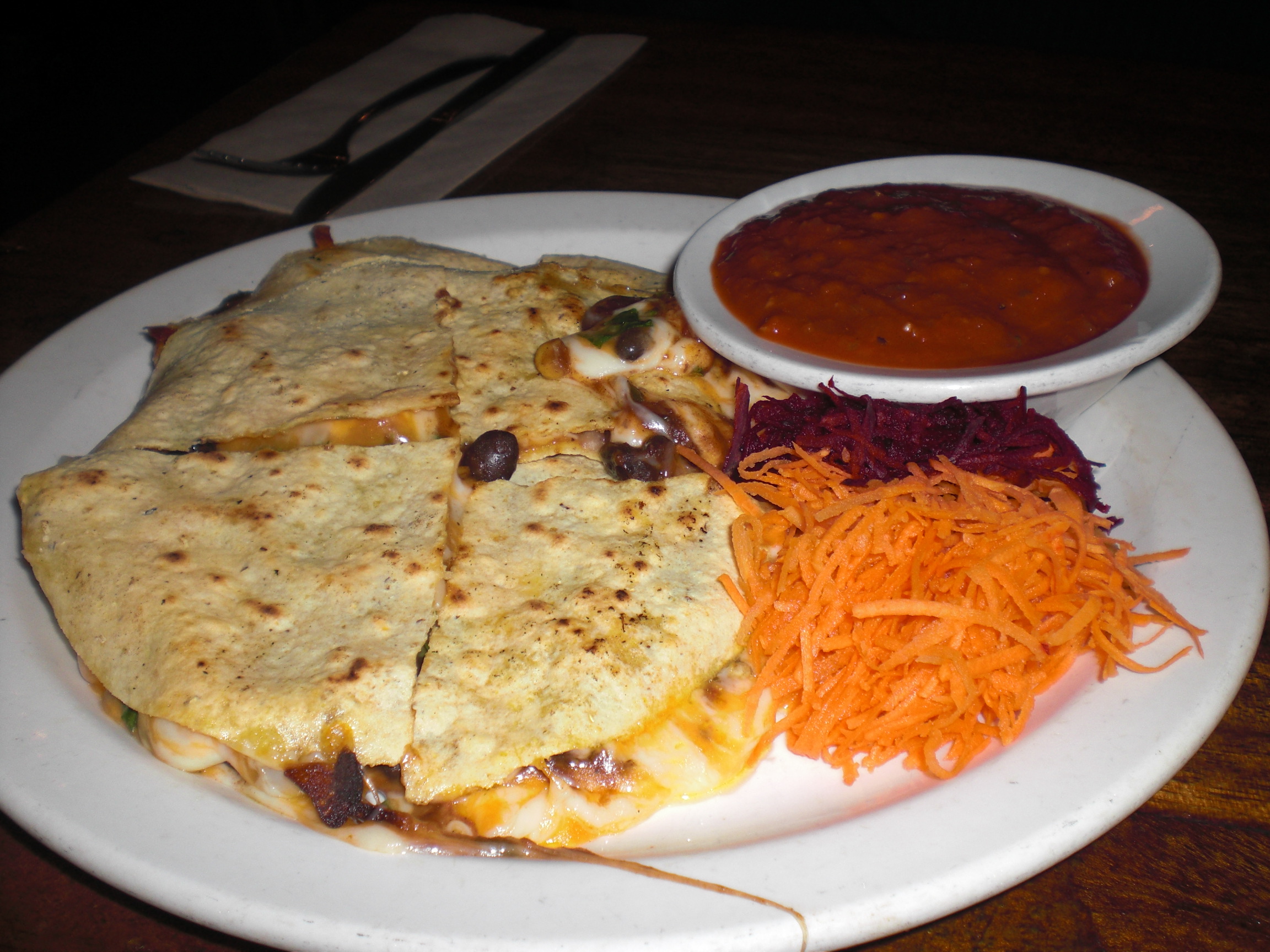 We started with the Oxacan Quesadilla’s served with Salsa – Red & yellow organic corn tortilla’s with chili, red onions, cilantro, jalapenos & cheese ($8.95) & the Sesame Fries & Miso Gravy – Hand cut potatoes baked with sesame seeds with a side of Miso Gravy ($7.20). You can get the fries with Cheese or both if you like.