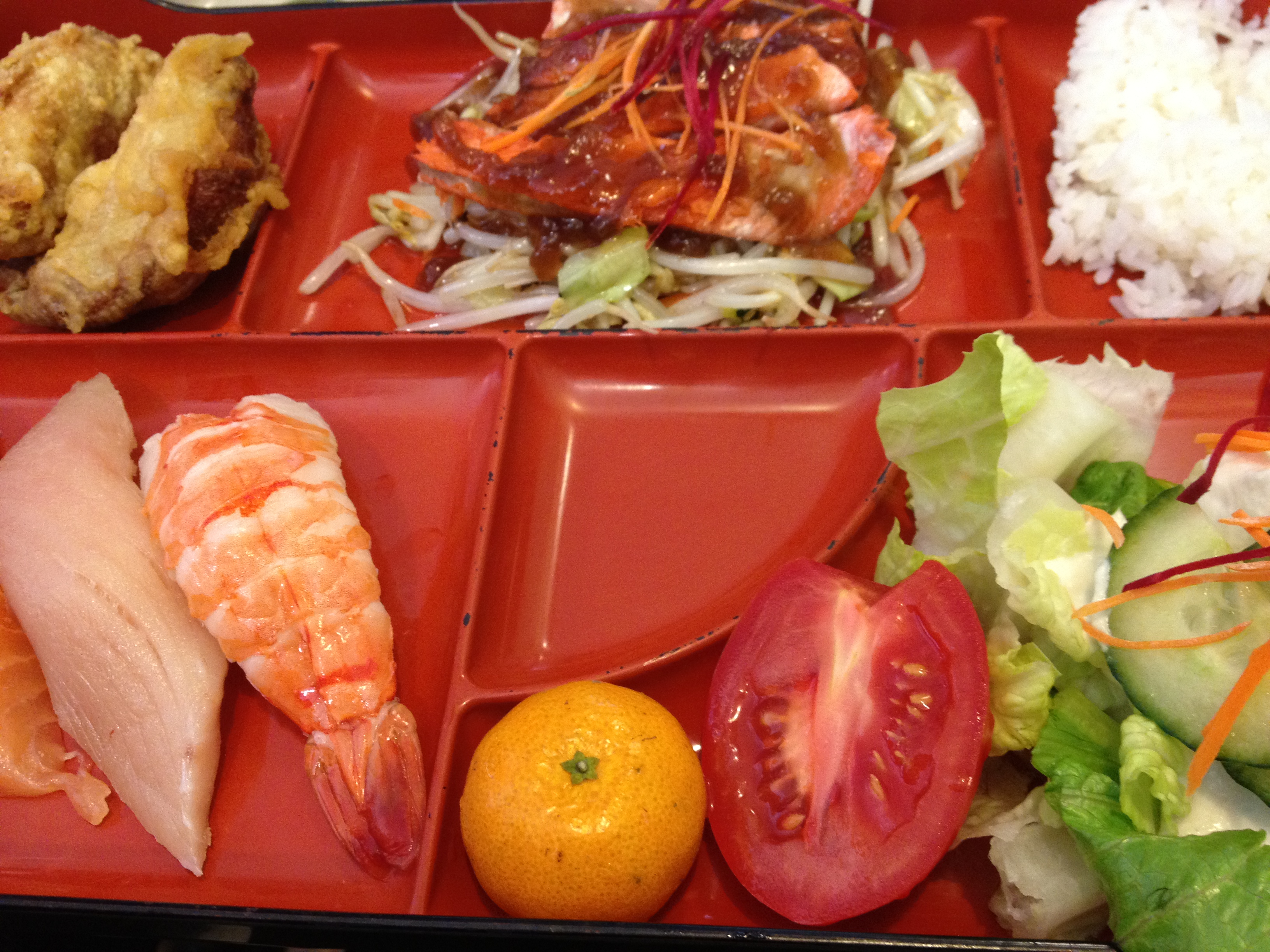 Their lunch menu is ridiculously affordable: Most combos range from $6-8. That’s not a bad deal for lunch. The bento boxes are very popular, they have a salmon teriyaki bento that comes with salad, rice, karaage and salmon, tuna and ebi sushi.