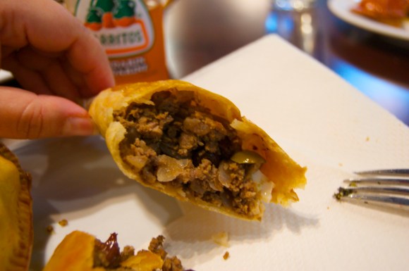 We order two large empanadas, each $3.95. The small empanadas are $1.50 each. The pastry was consistent with all of them: flaky, very much like an Italian calzone.