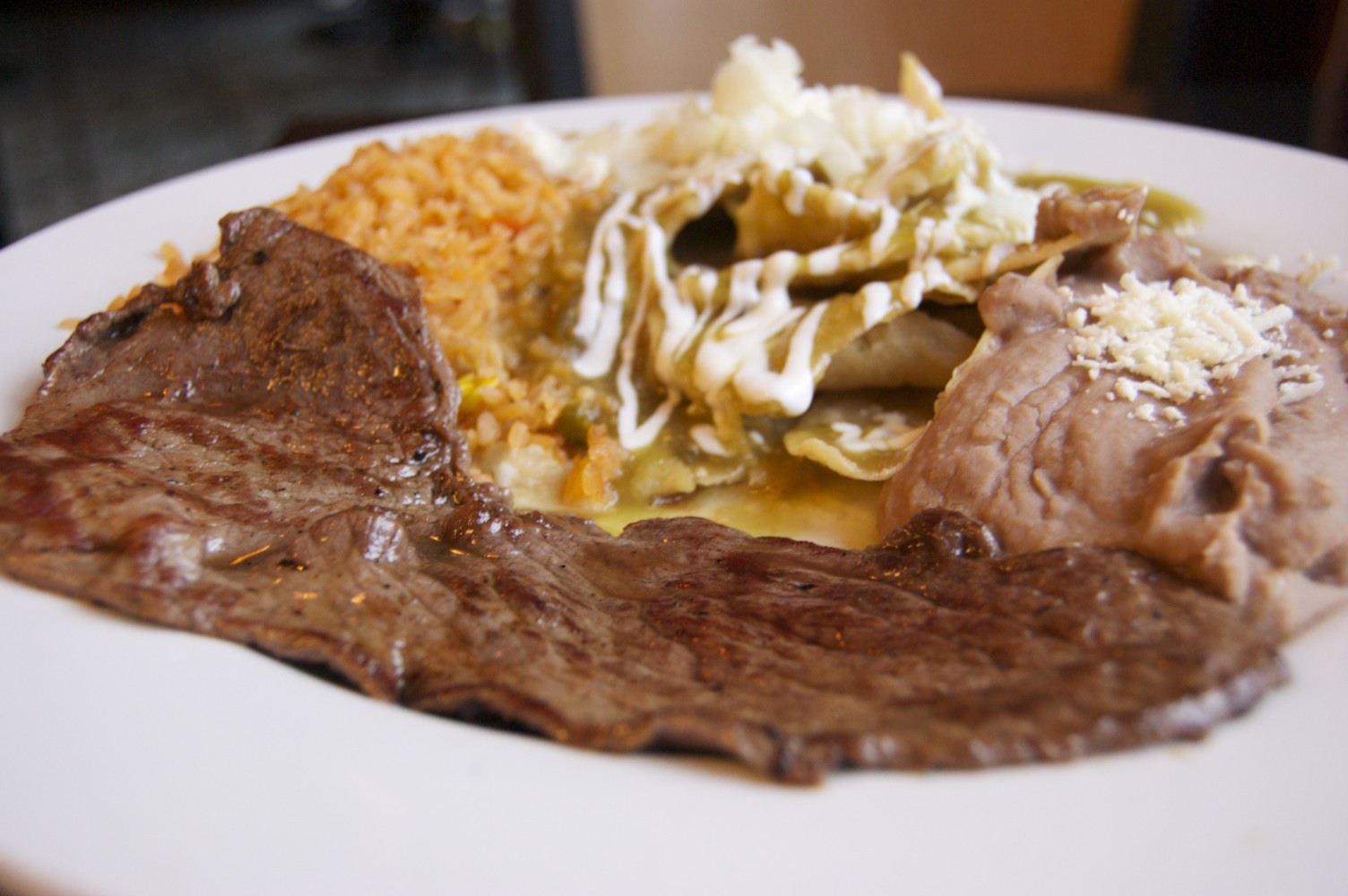 If you’re interested in trying a nice sample of the menu in one dish, I recommend the Carne Asada Con Chilaquiles ($15) This dish is a thin slice beef sirloin grilled with Mexican spices and served with chilaquiles, a side dish made with diced tortillas topped with sour cream, cheese and onions. It also comes with refried beans and rice. The Chilaquiles came with a nice green tomatillo sauce that was very tangy. Such a tasty entree.