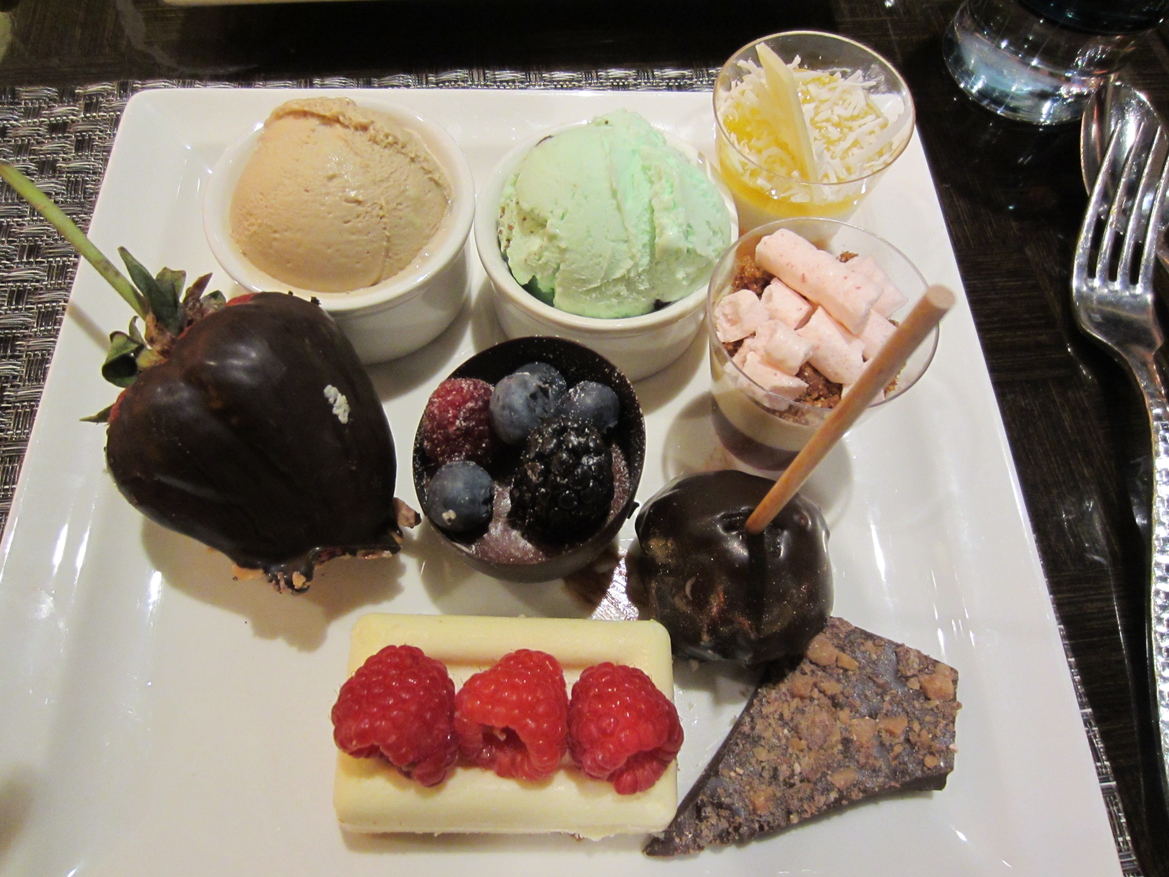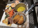 Food quality – although some of the dishes (such as the Green Curry noodles) were overly salty, there were several outstanding dishes! Their BBQ pork ribs were moist and juicy; best green bean salad I’ve had at a buffet; giant slice of smoked salmon with capers; gelato bar featuring over 10 flavors freshly made (Pistachio was a favorite among my friends); giant chocolate-dipped strawberries; and their light/fluffy mousse filled dessert shooters in various flavors stood out in the dessert section. What I also liked was how the cocktail prawns were de-shelled and came with cocktail sauce and a slice of lemon in a shot glass – no need to use your hands to peel them!