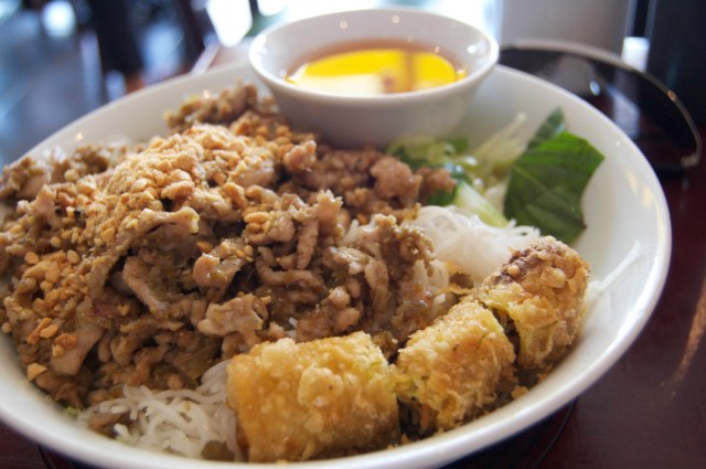 Josh ordered the Thit Bo Xao Sa Vermicelli Salad Bowl. Lots of fresh lettuce, herbs, beans sprouts, cucumber, pickled carrots, scallions, roasted peanuts. It also came with lemongrass beef and a chicken spring roll. His dish looked so amazing, and it was only $7.95.