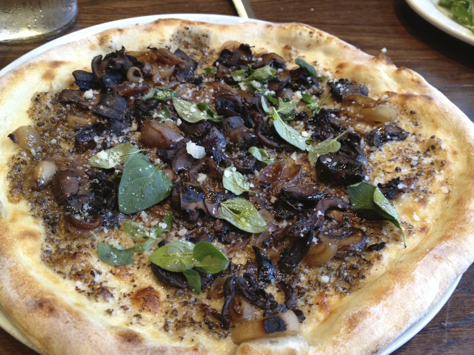The gentlemen ordered the Funghi Pizza ($15) Mushroom cream, cipollini balsamic onions, mixed crimini, portabella, and oyster mushrooms, and topped with fresh oregano, grana padano and evoo. The onions give this pizza a light sweetness.