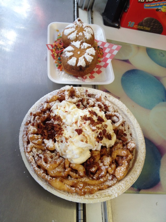 And finally we headed over to Granny’s Foods to try out their Deep Fried Kool-Aid. I was very curious about that… how do you fry a beverage? Turns out that it’s essentially a donut that has Kool-Aid flavoring in it. So, something that sounds a bit more exciting than it is, but still tasty none the less!