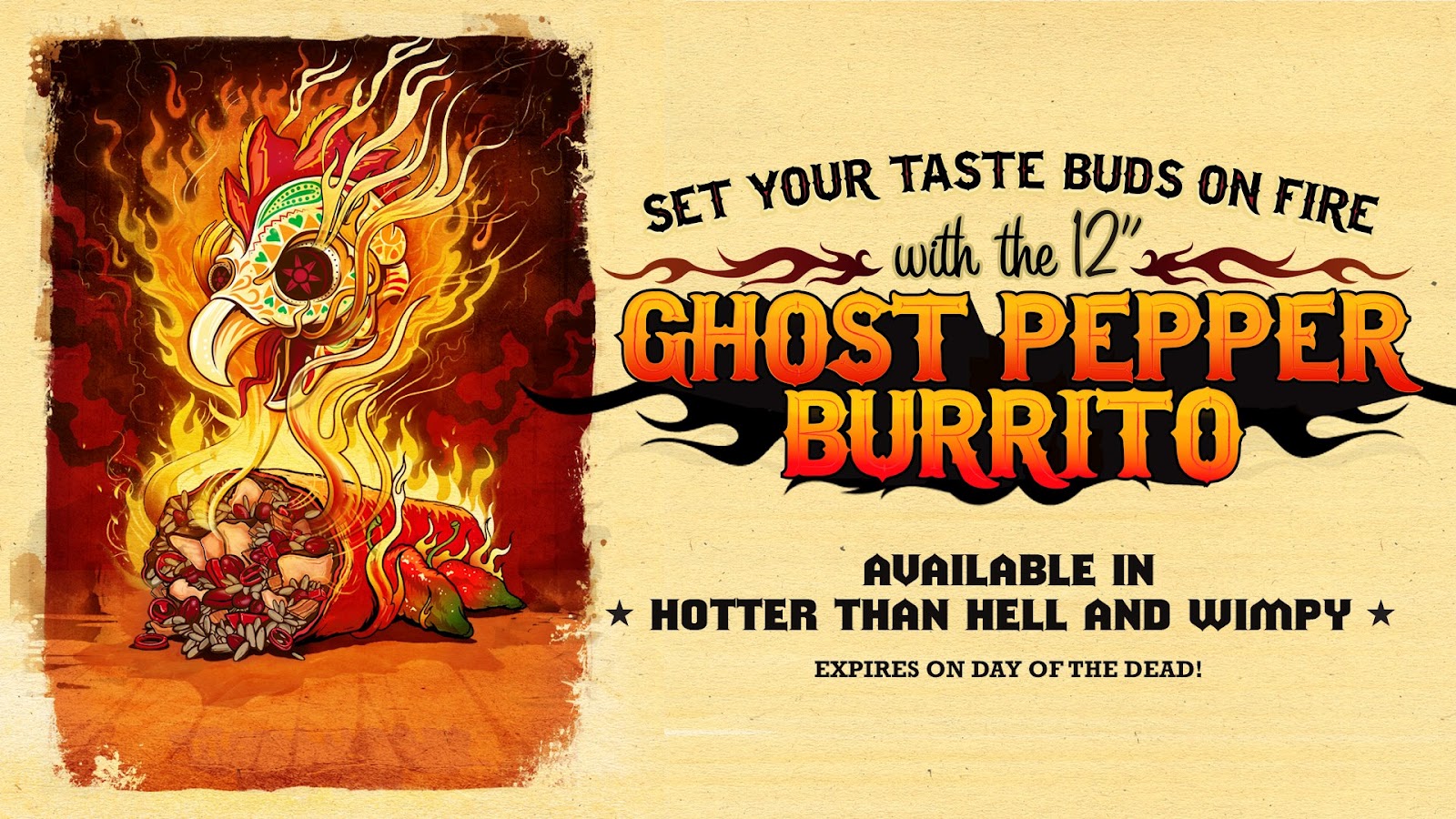 For a limited time only, Mucho Burrito, the fastest-growing Mexican restaurant chain in Canada, announced that it has become the first national food chain to use the ghost pepperas part of its menu offering. The limited-time Hotter than Hell and Wimpy 12-inch Ghost Pepper Burritos will be available until November 2, the Day of the Dead, at Mucho Burrito locations across Canada.