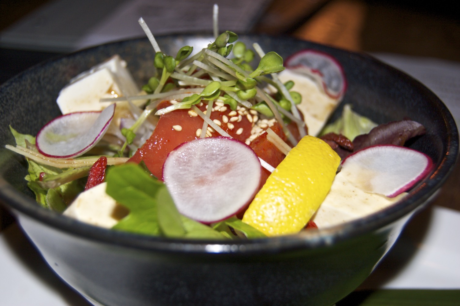 My dinner started with the delicious Tomato Kimchi Tofu Salad – organic greens tossed in a sesame soy dressing, with ginger, tofu, and la piece du resistance – kimchi-marinated tomatoes. There were so many wonderful flavours and textures mixed in this dish, I couldn’t tell you what I loved the best. The tofu had a good consistency, not mushy, but firm, and the tomatoes had a mild spicy flavour that just gave the salad the perfect touch of spice.