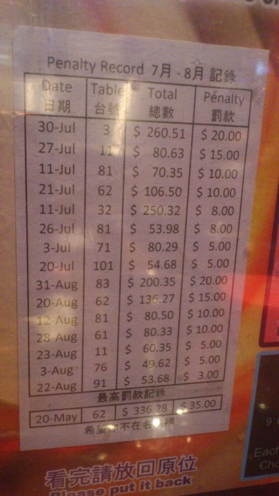 Note, they will penalize you if you don’t finish your items that you ordered. They event post a small little chart outlining how much past tables of customers have been penalized ($1 an item) for not finishing the items ordered (although I’m not sure if they actually did that or not).