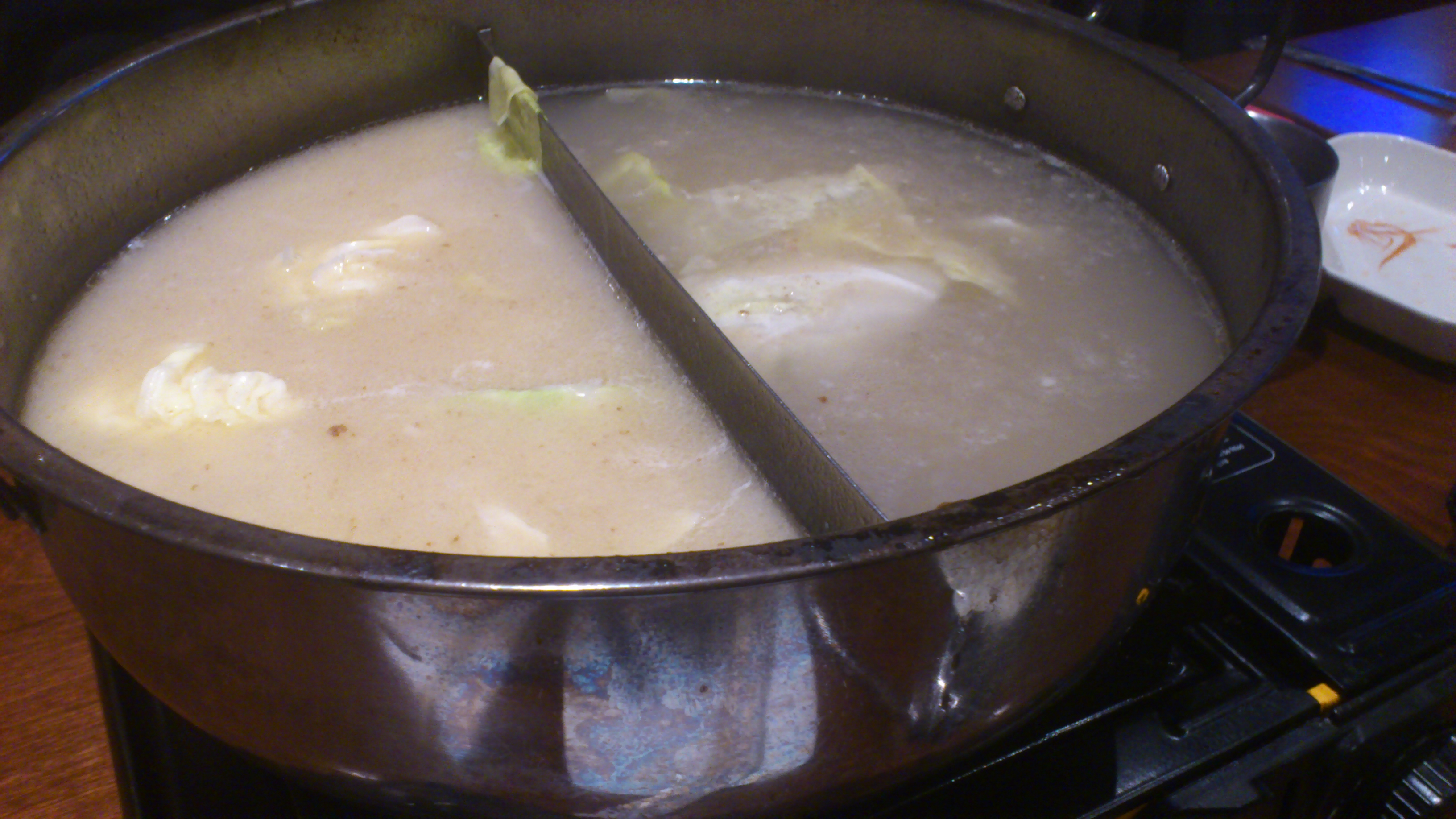 Here’s the catch though – the price does not include the soup base, which ranges from $7 – 9 depending on the base. We decided to go for the $8.98 Ying-Yang soup base, allowing us to choose two different soup bases on the menu, one on each half of the hot pot. We chose the Japanese Milky soup base (milky beef broth) and the Japanese beef bone broth.
