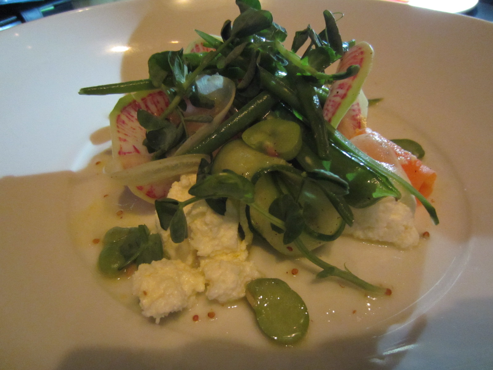 This is one of the most beautiful salads I’ve ever eaten, such wonderful presentation. Fresh peas, fava beans, watermelon radishes together with house made sheep milk ricotto mixed in a citrus and mustard dressing. The dressing is very tangy but the ricotto cuts into it nicely.