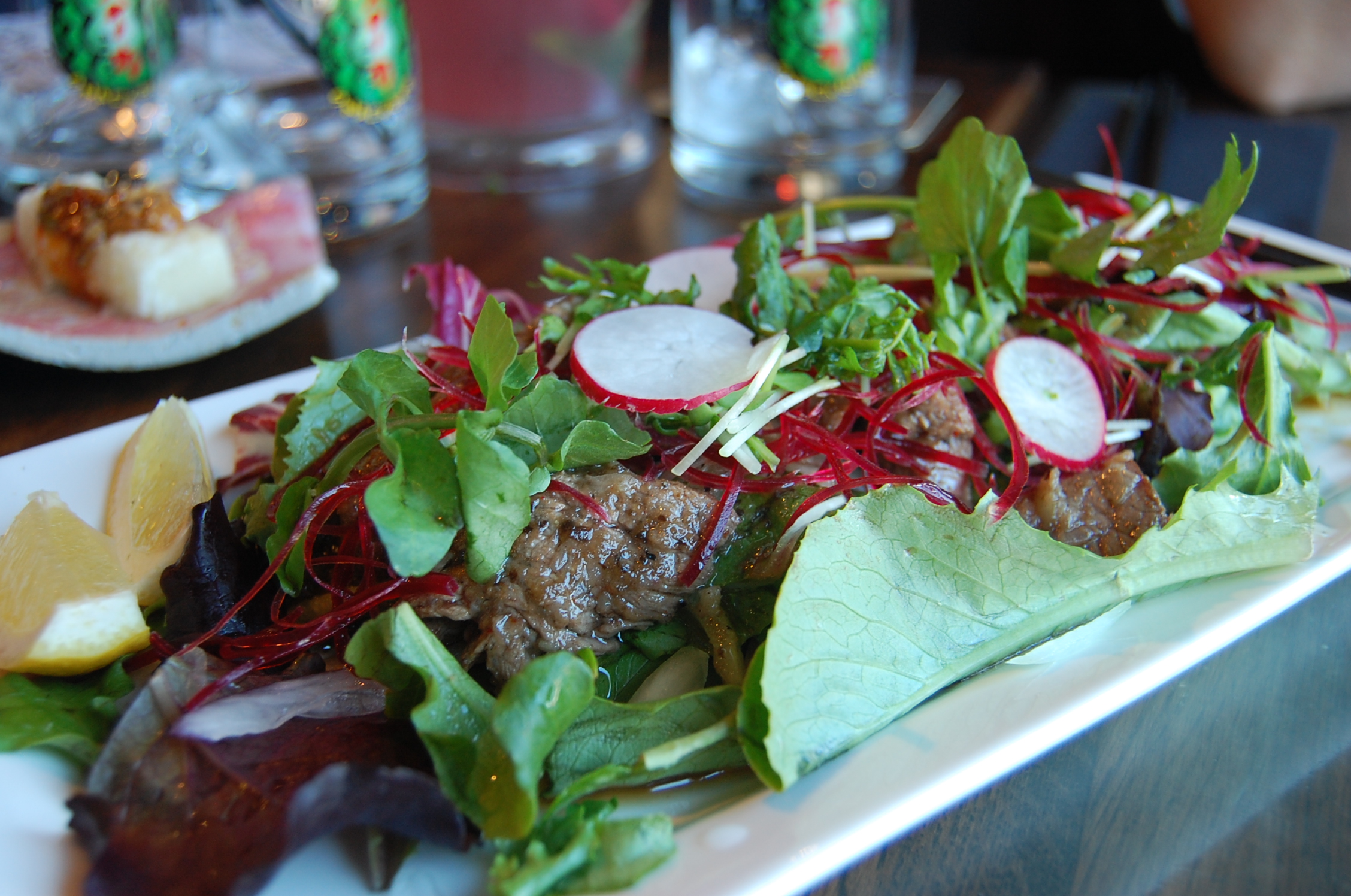 Steak Salad – A large salad of organic greens topped with diced & marinated AAA beef filet steaks with watercress and grated beets, mixed with a light citrus dressing. This is the perfect dish for those hot summer nights! The beef is tender and it just melts in your mouth. The veggies are fresh and crispy. A winning combination.