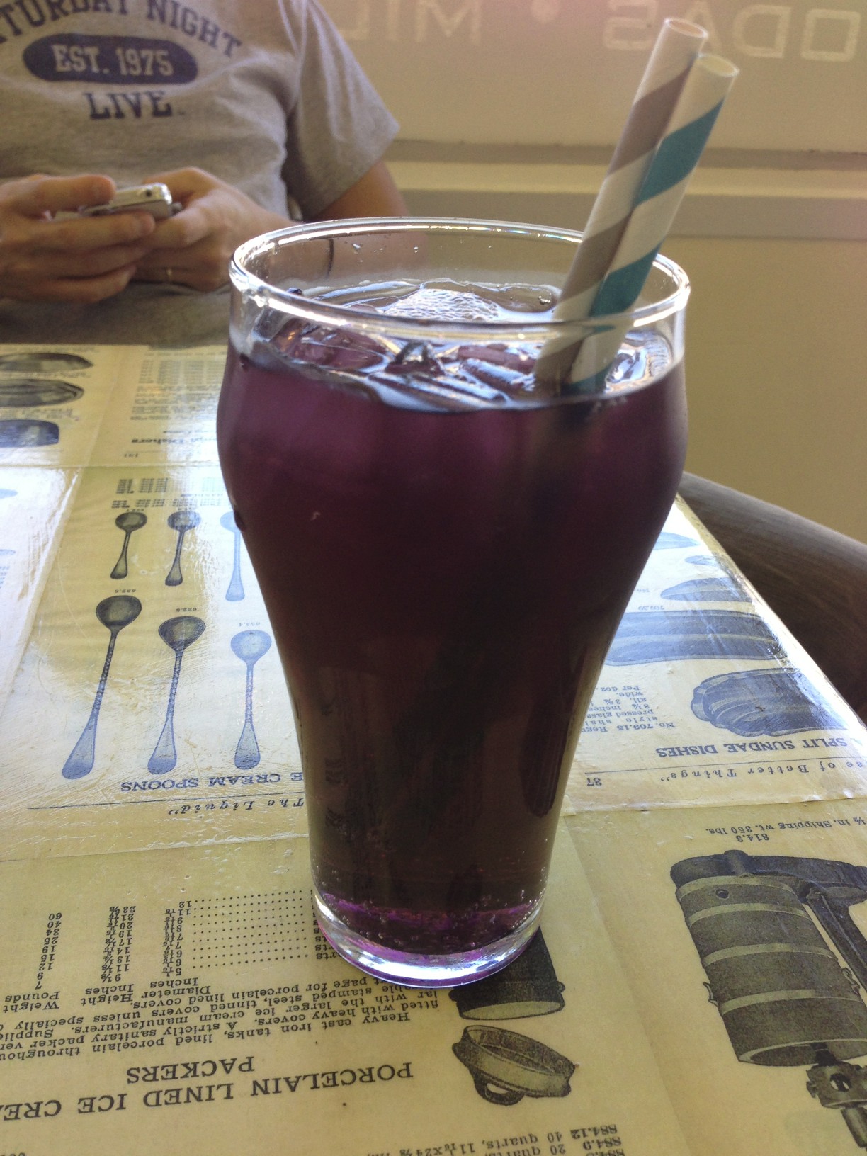 The decor is retro. Walking thru the door is like stepping back into a simpler time. One of the fixtures of the shop is a 1931 Walrus soda fountain, which is used to make any soda combination imaginable. Their choice of syrups is extensive: Anything from banana, lavender, grape, coffee, strawberry, ginger, cherry,blueberry, vanilla, lime, green apple, sarsaparilla and many more.