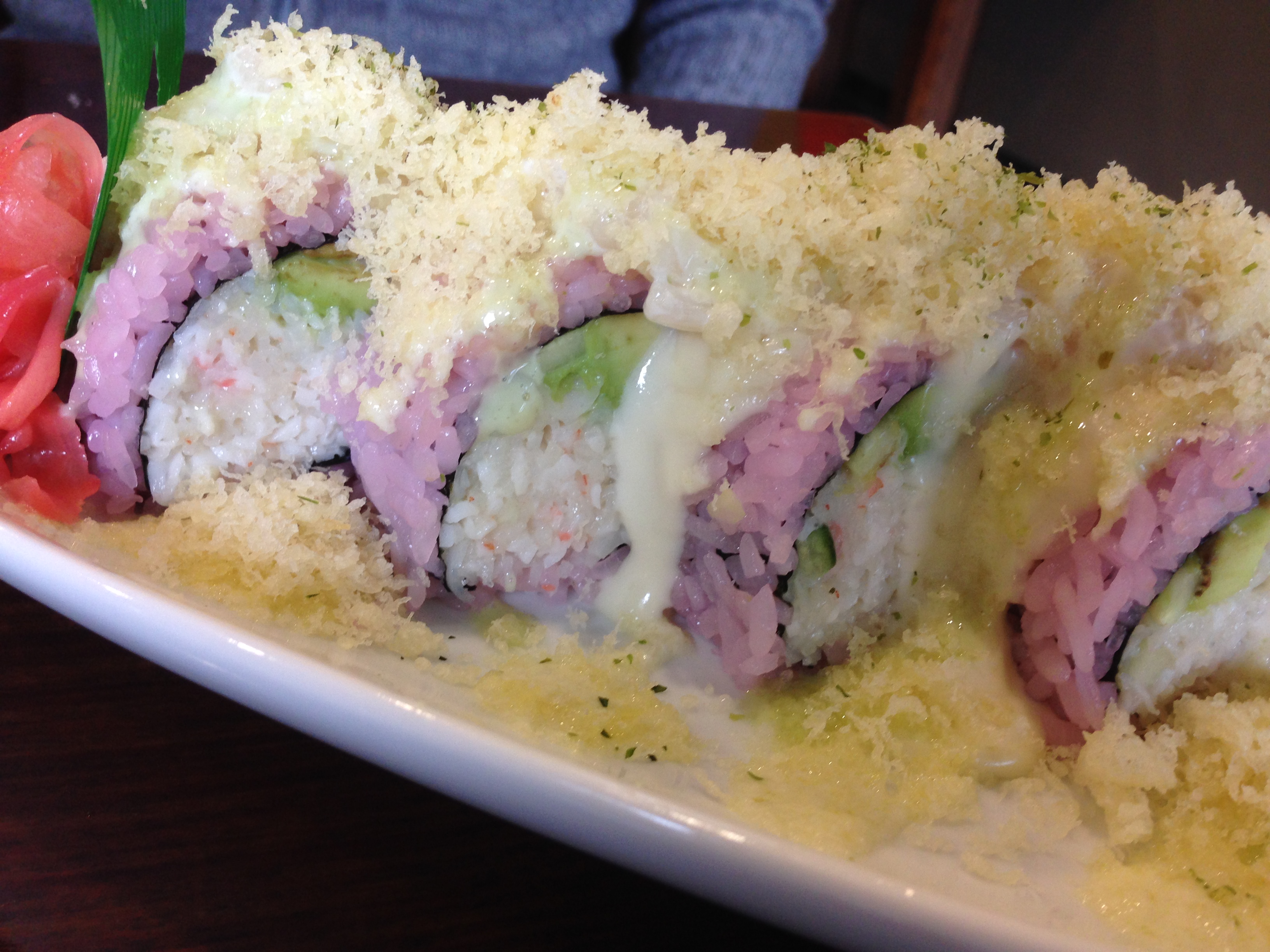 Okonomi sushi uses pink rice for their sushi. This is plain white rice that’s been infused with fruit and vegetable extracts to give it a nutritional punch. Pictured here is their White Whistler Roll ($8.95) – crab meat, cucumber, avocado, tempura flake and cream cheese sauce. Another roll worth sharing. I found the cream sauce a tad heavy for sushi, not sure if I liked the combination. I found it very heavy.