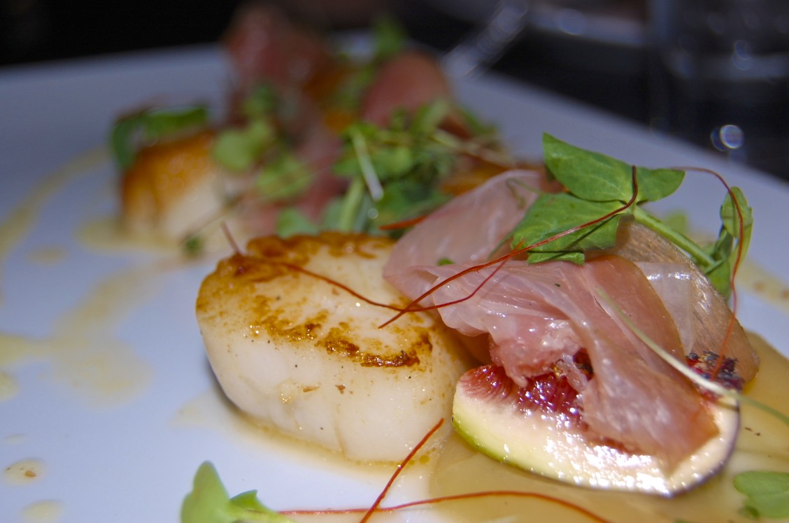 Seared Baja Ocean Wise Scallops, sweet potato, figs, and prosciutto.