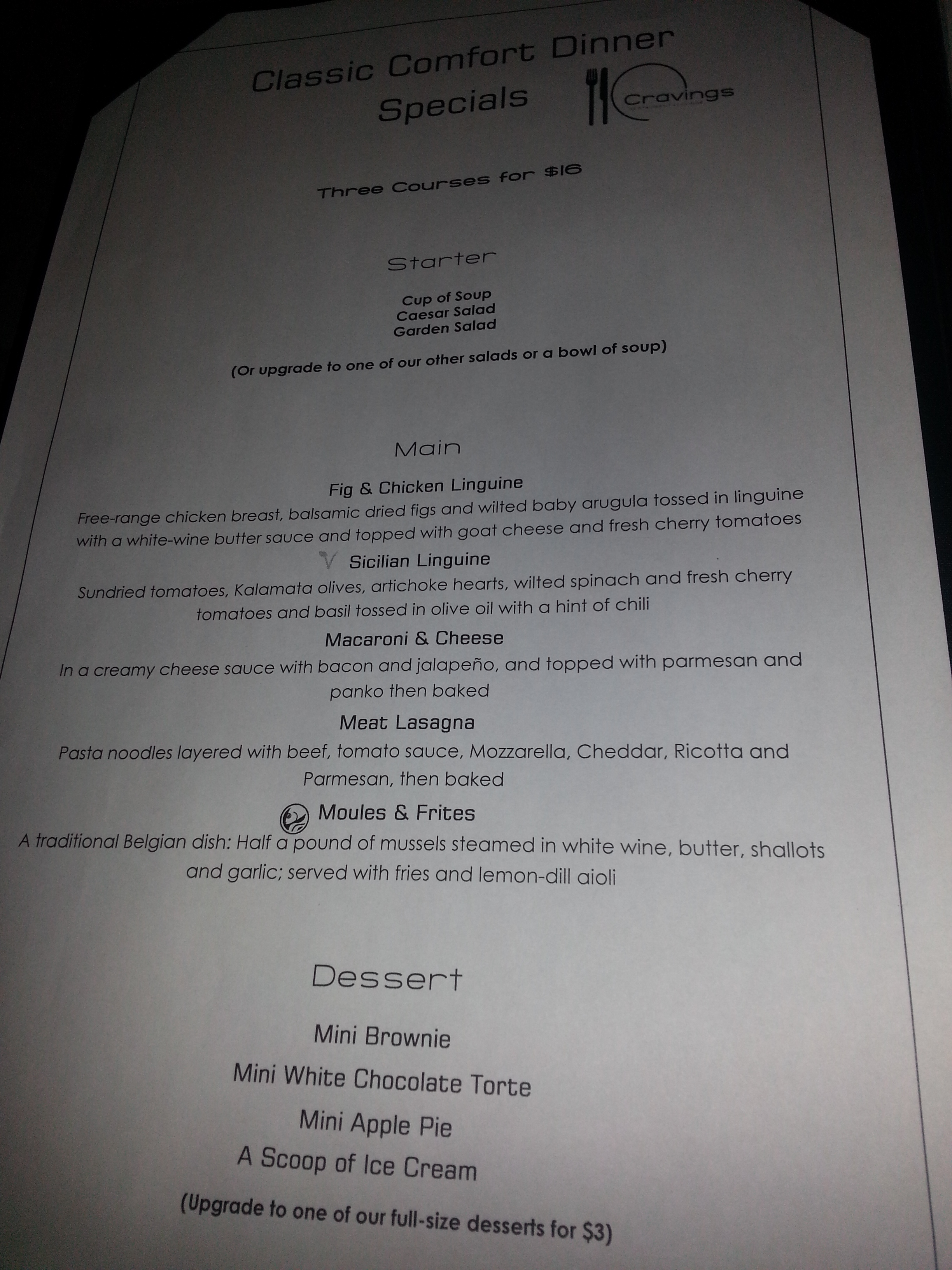 The set menus were popular with our group. Most diners in our group ordered from the $16 menu. My hubby and I ordered 1 $16 set menu, consisting of Cup of Soup – Cravings’ Spicy Chicken Soup, Moules & Frites, and Mini White Chocolate Torte.