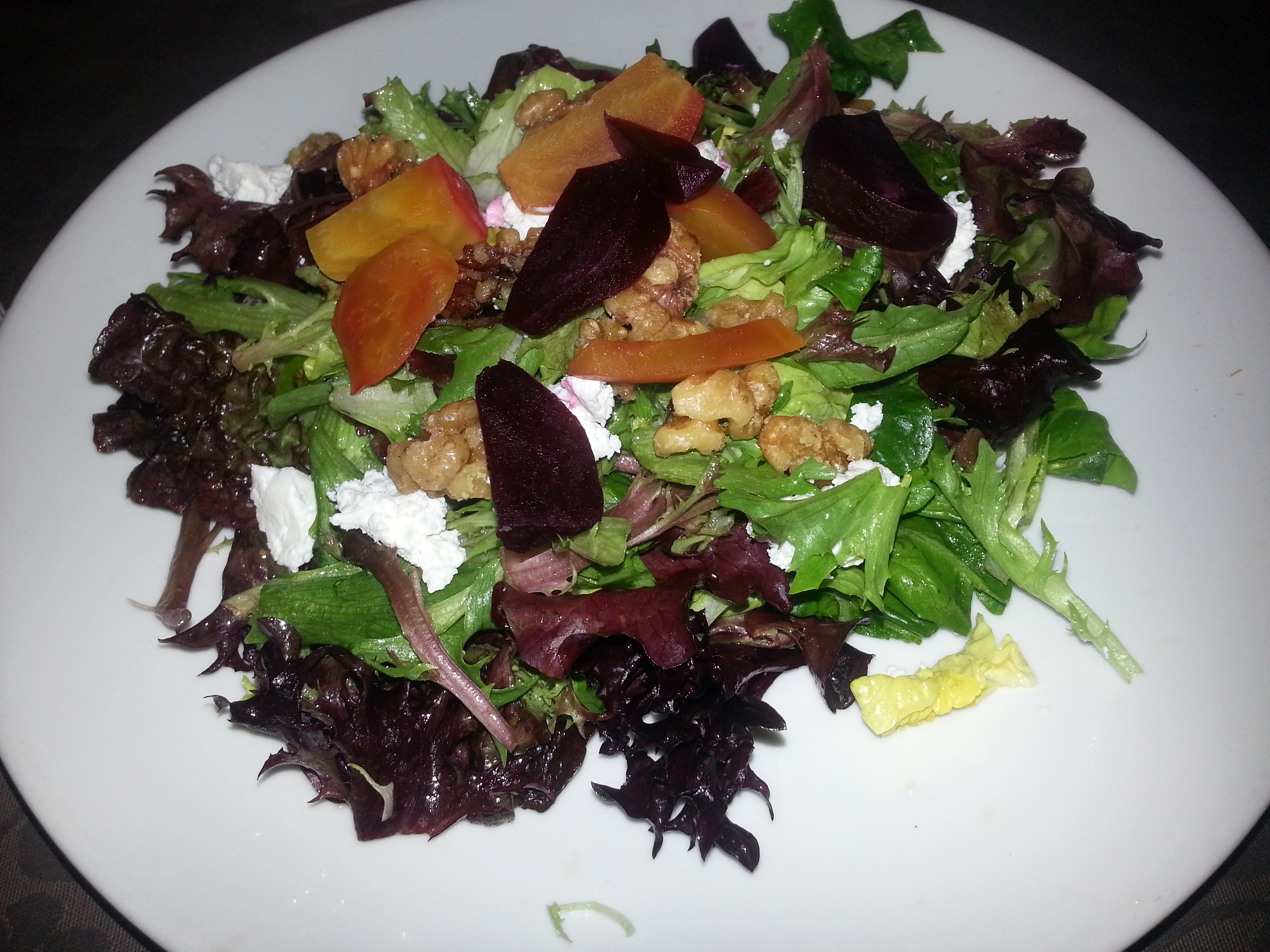 Since we weren’t particularly hungry, we decided to order just one set menu, and an additional entree. I decided to order the large (main) Beetroot and Goat Cheese Salad. The Beetroot and Goat Cheese Salad consists of a bed of mixed greens with red and yellow beets, candied walnuts, and creamy goat cheese dressed with a maple vinaigrette. I really enjoyed the beets and wish they had offered a bit more of the beets. The goat cheese was smooth and creamy.