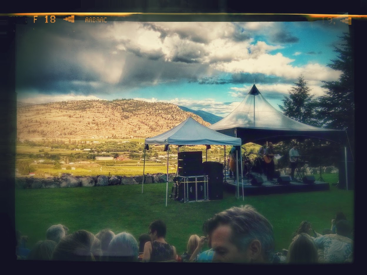 In my last Okanagan trip, we visited Tinhorn Creek for a concert. Every summer, Tinhorn Creek puts on concerts once a month. You can bring your own picnic basket, a blanket and watch some of the best acts while overlooking the gorgeous valley in Oliver, BC. The night we went, one of my favourite bands, The Booms Booms were playing. While it had been raining intermittently the whole day (a rarity in Oliver!), the rain stayed away during the show. It may be the bottle of Pinot Gris my husband and I shared, or the amazing food coma I was put in after the fantastic food from Miradoro, but wow, what I show. The view was awesome, the crowd was fun and I was reminded how lucky we are to live in such a beautiful province.
