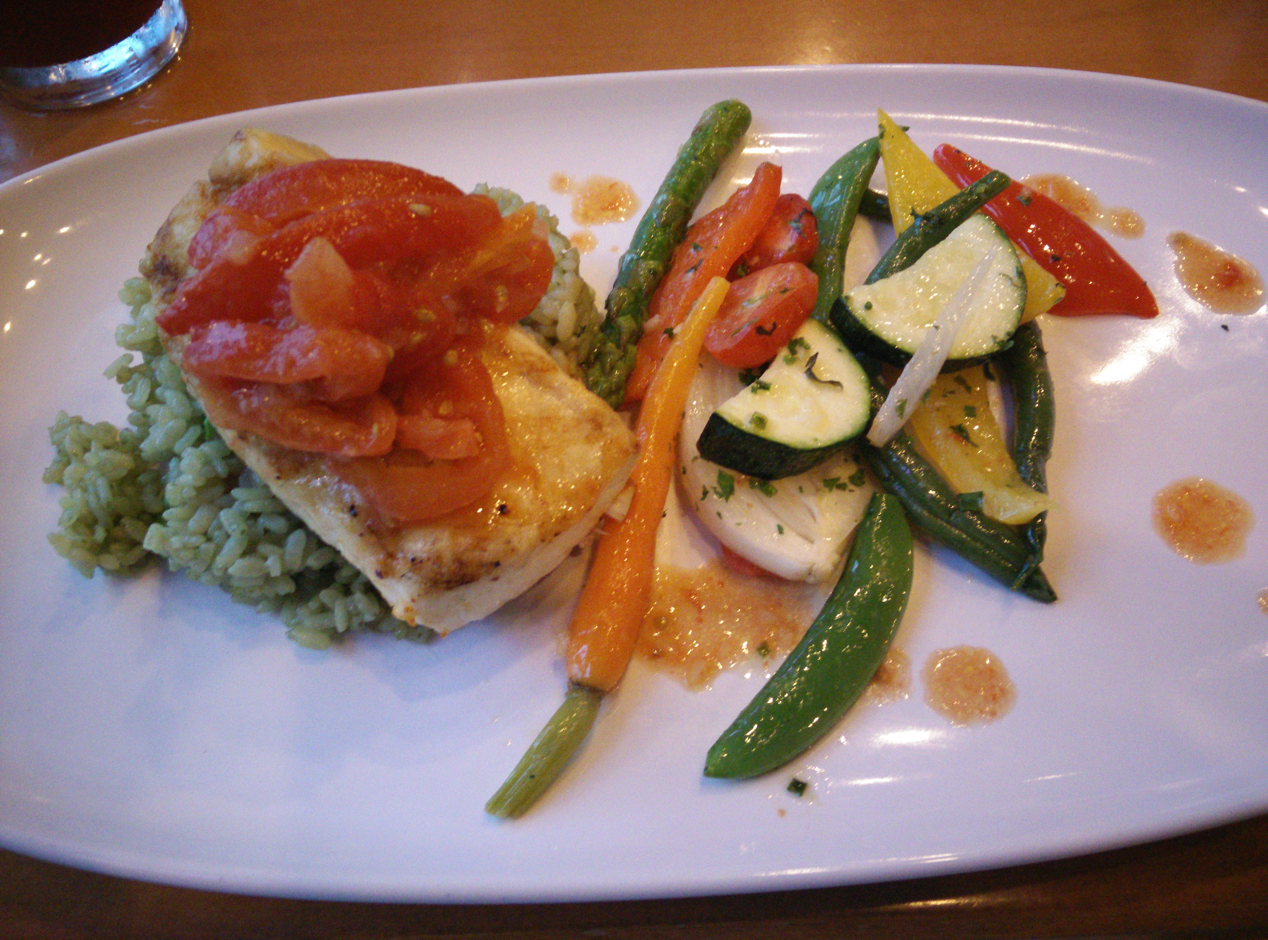 Our meals shortly came after finishing the appetizer. I ordered the fresh seared halibut, on top of asparagus rice and fresh market vegetables. I really enjoyed the asparagus bamboo rice and the market fresh vegetables, a myriad of fresh grilled zucchinis, asparagus, green beans, carrots and red bell peppers.