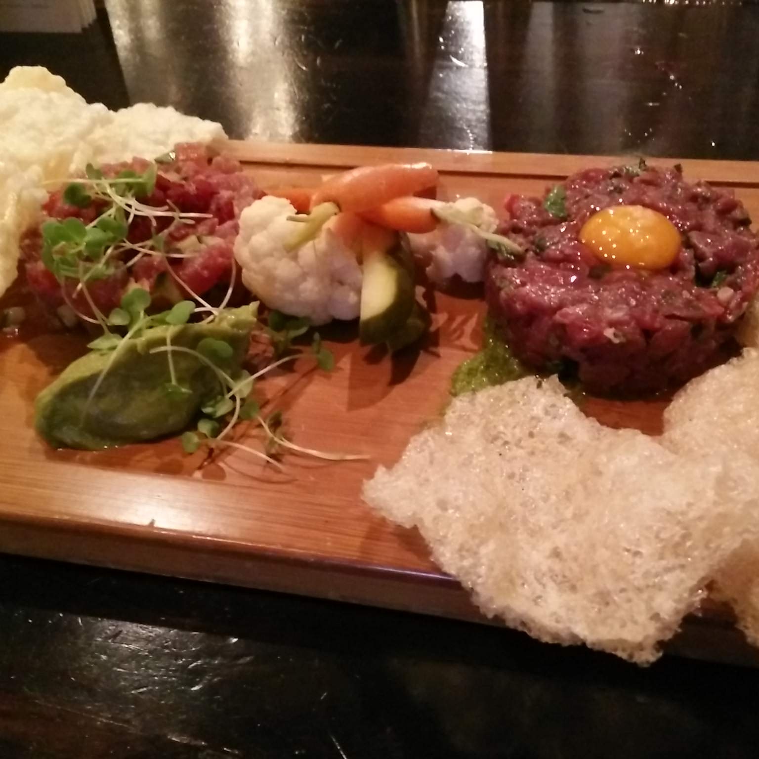 While enjoying cocktails, Chef Derek Bothwell came out with our first sharing platter – the Earthwise Platter is a platter of fresh raw and grilled vegetables, all locally produced out of the Earthwise Society farm in Delta – fresh asparagus, radishes, carrots, beets, peppers, and more! We were next introduced to the Tartare Duo of Ostrich and Ahi Tuna, on their menu served separately and paired with some chicharron and house-puffed rice crisps to scoop with.
