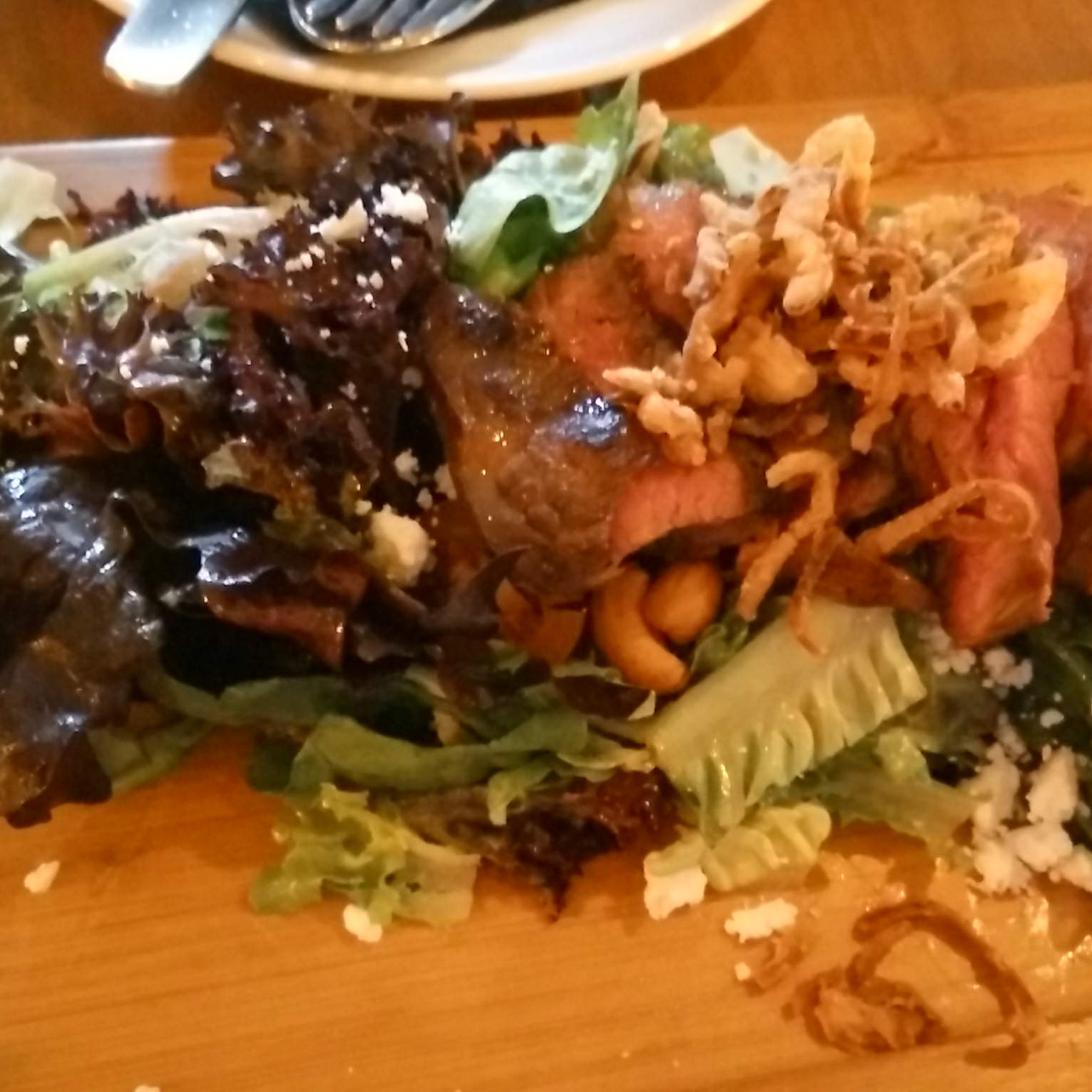 We were then lead to some cozy seating in the dining area where we had the pleasure to dine with Jordan Stewart and chat with him about inspiration for his menu and drinks. Their house white wine, Murder of Crows Chill Winston White by Okanagan Crush Pad was named after an adventure both Jordan and his partner Sonia experienced while travelling. We shared a Tri-Tip Salad, which included seared bison and fresh mixed greens farmed from Earthwise Society. Jordan explained instead of steak, they source sustainable meat such as bison as an alternative.