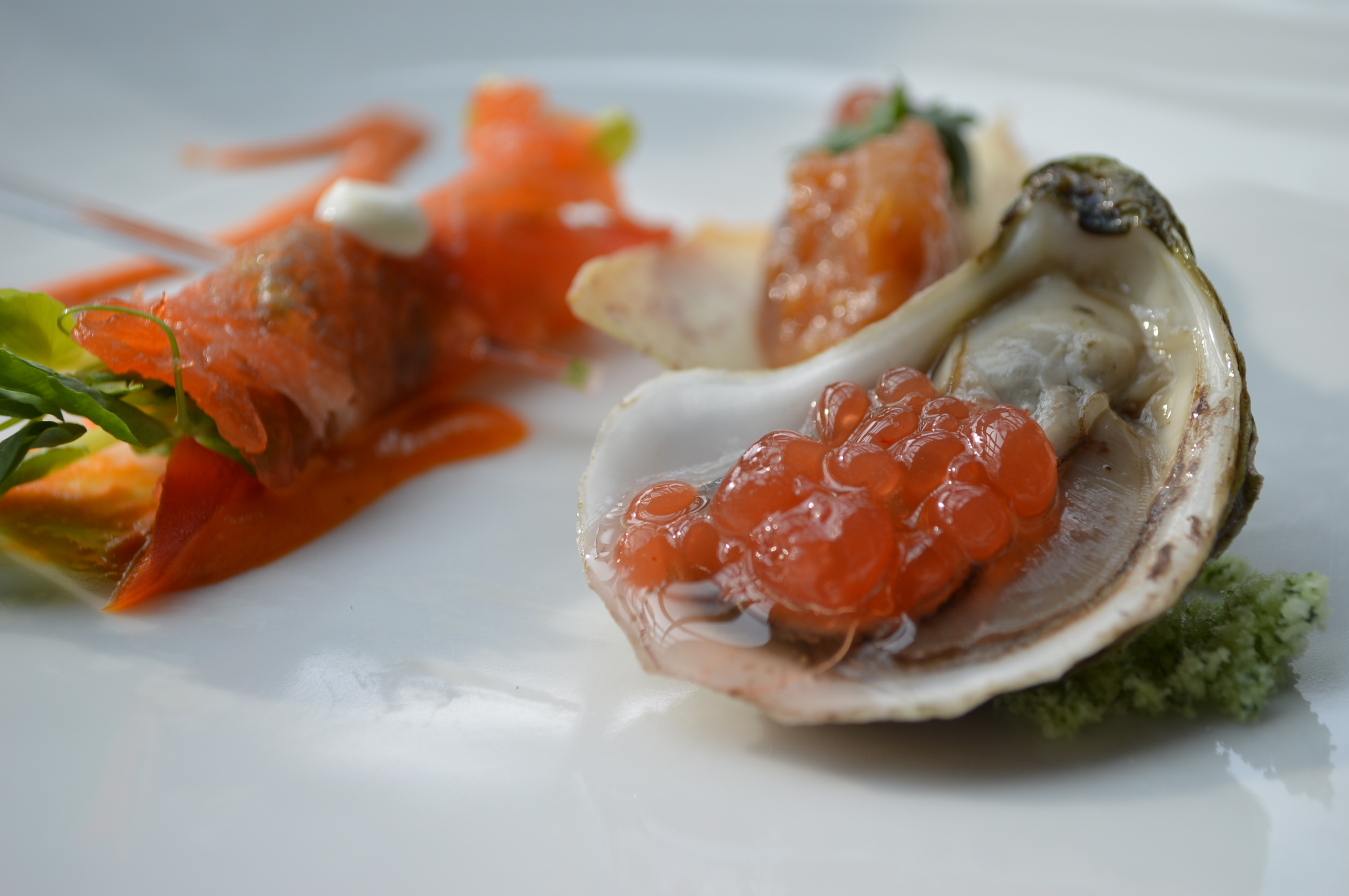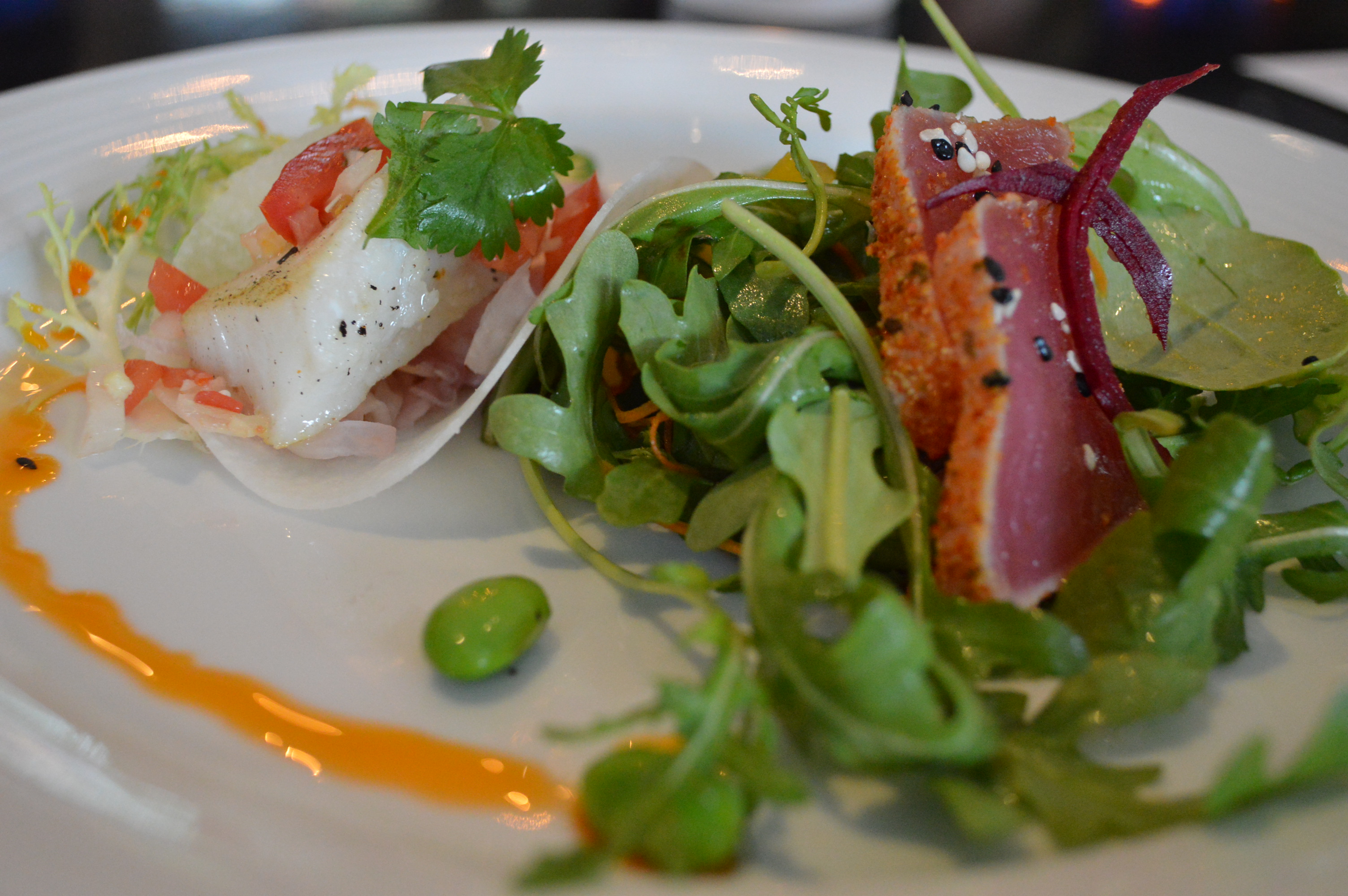 Their Tasting Plates offering included tuna tartar with ponzu ginger on a tarrow root chip, salmon tataki with creme friache and pea shoots and finally, an oyster shooter topped with tomato jelly. Such elegant servings.