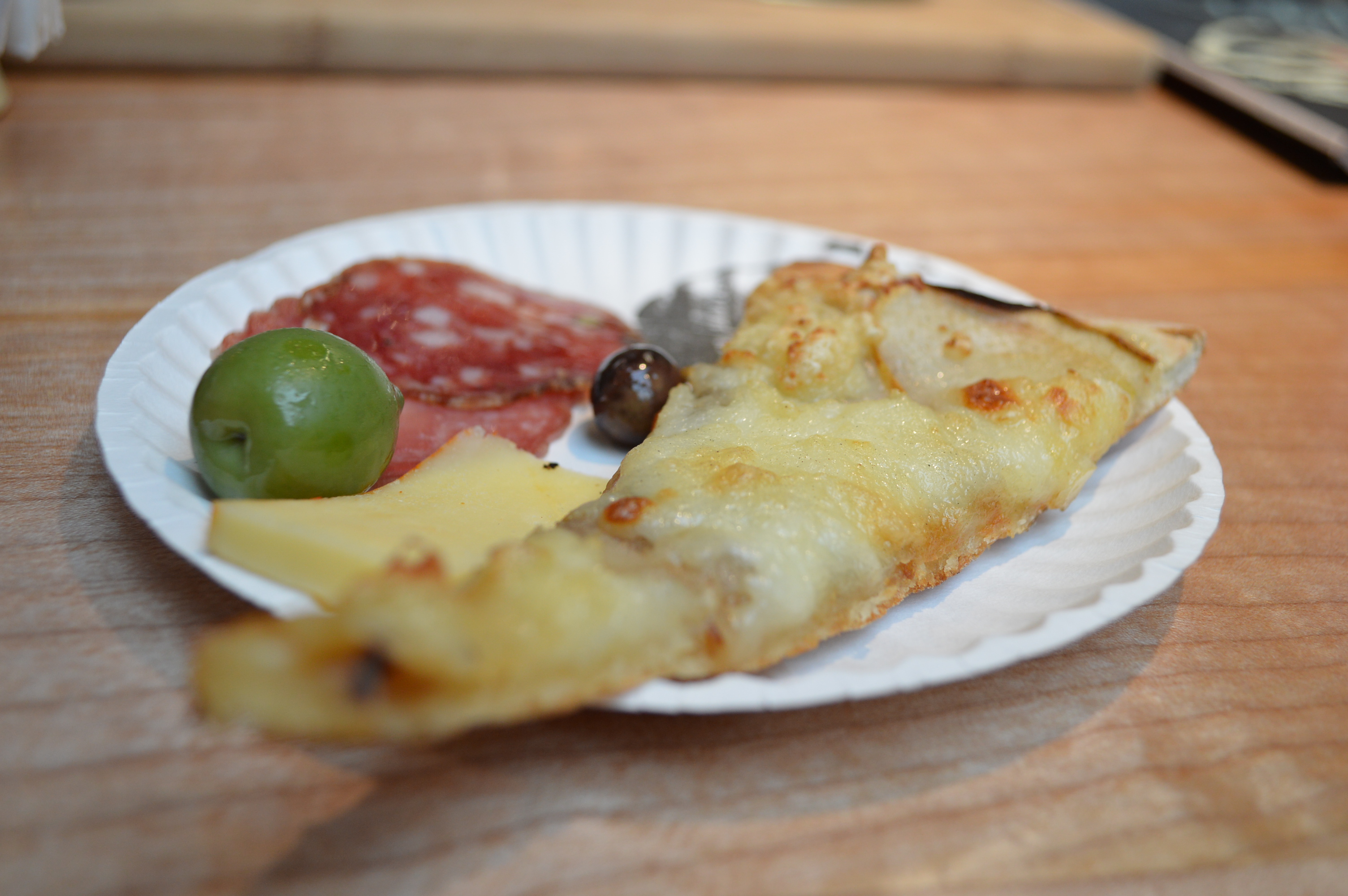 We crossed the hall to the Bowen Island Pizza Company (which is also a deli), where we got a slice of their signature Pear and Brie Pizza. It was paired with cheese, olives and a couple of slices of cold cuts from Two Rivers Meats.