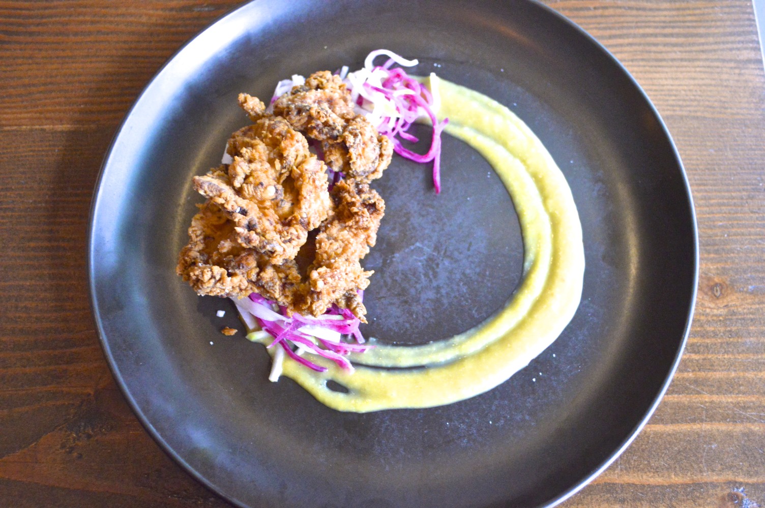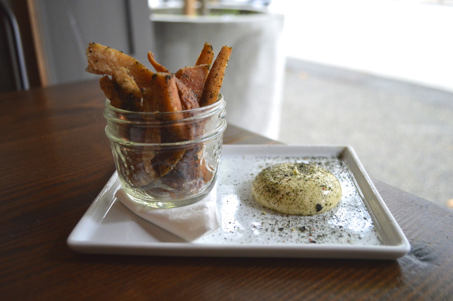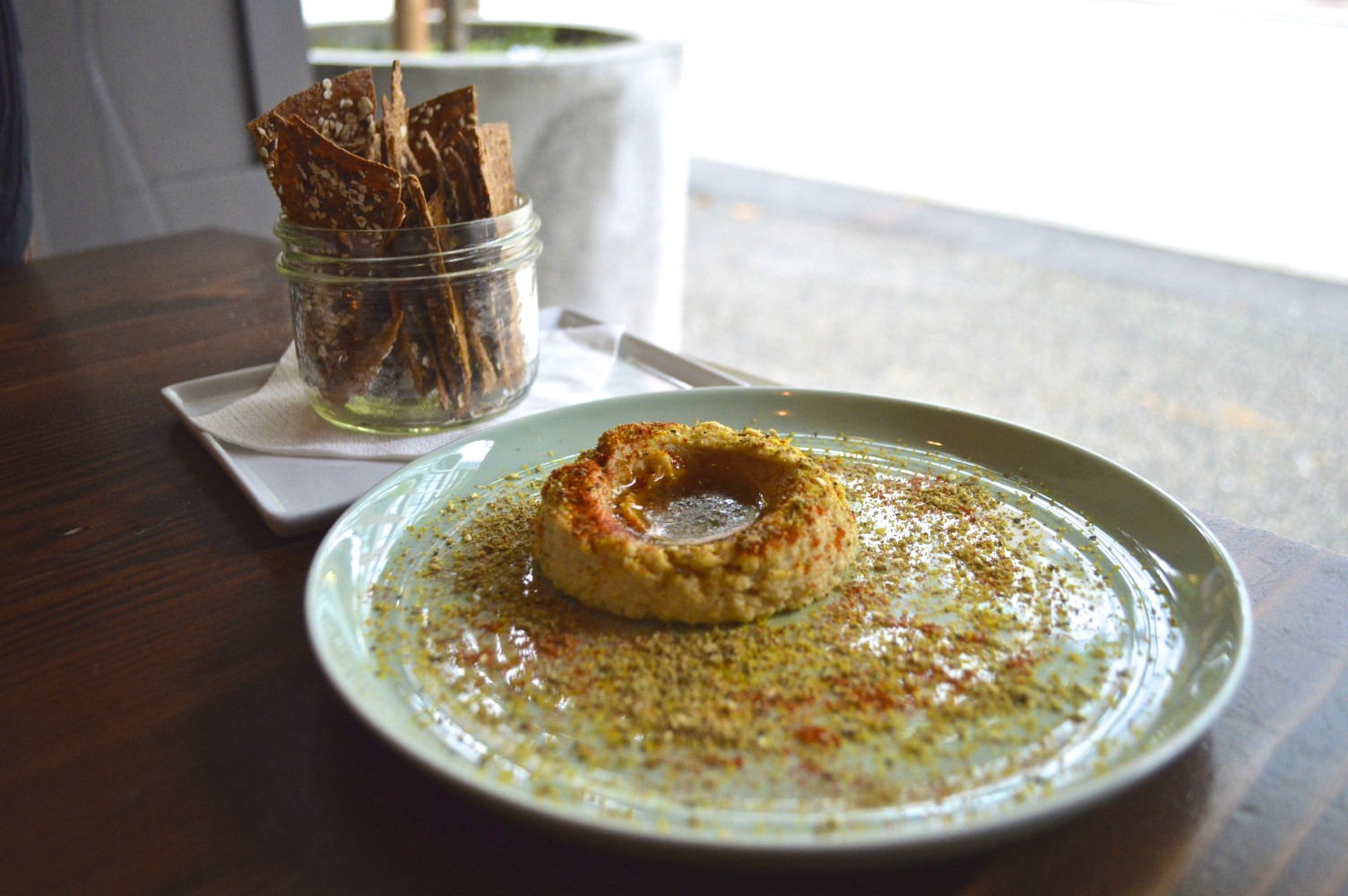 The Hummus was big enough to share. Nice hints of lemon, good texture and a bit of smoked paprika and served with homemade wheat crackers. Every dish was served with expert design and was beautiful to look at.