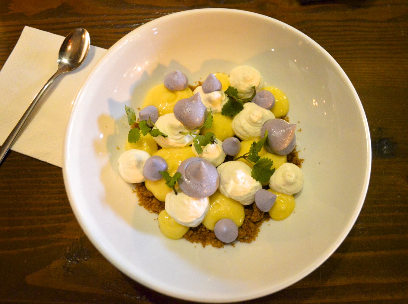 Save room for dessert! The Lemon Curd is Catch 122‘s take on the traditional lemon meringue pie. It’s served with delicate lavender meringues that melt in your tongue, and it’s topped with graham cracker crumble, and a bit of whipped cream. It’s garnished with lemon balm, which gives the dish a nice lemon scent.