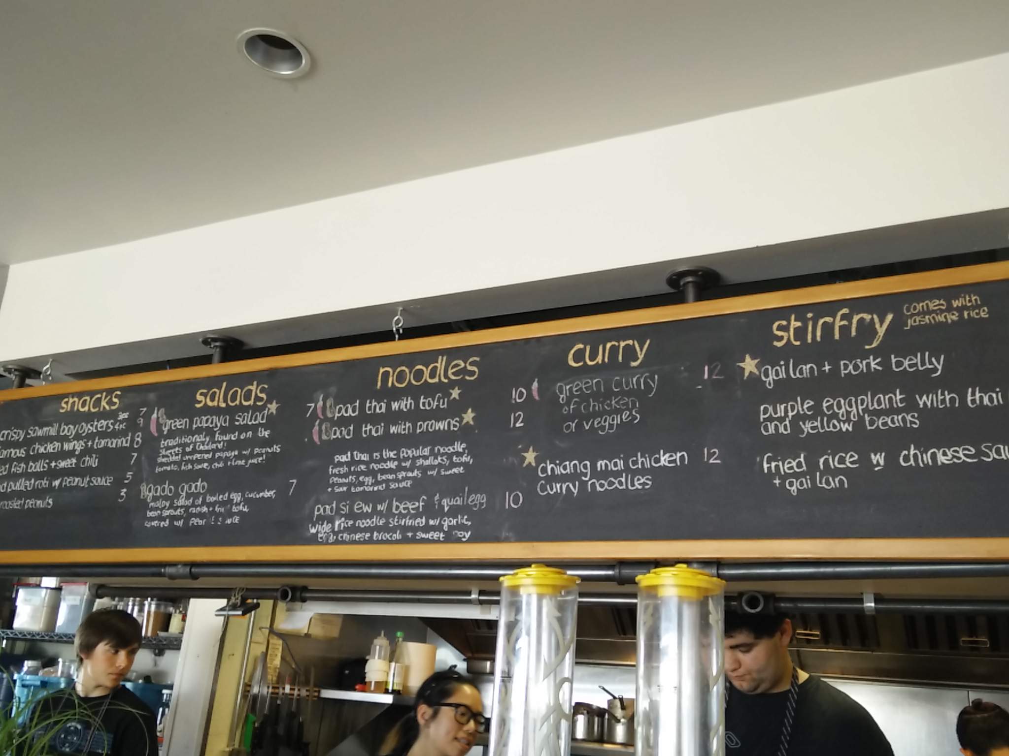 I ended up ordering their famous chicken wings with tamarind sauce, pad thai with prawns, gailan with pork belly on rice, and a papaya salad that was on special.