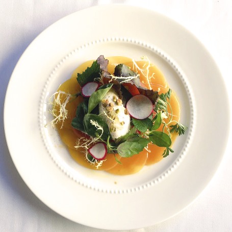 golden and chioggia beet salad, goat cheese and pistachios – smoked orange vinaigrette