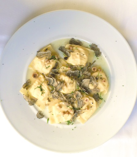 ravioli of goat milk ricotta and parmesan, truffle vinaigrette, parsley and roast hazelnuts.