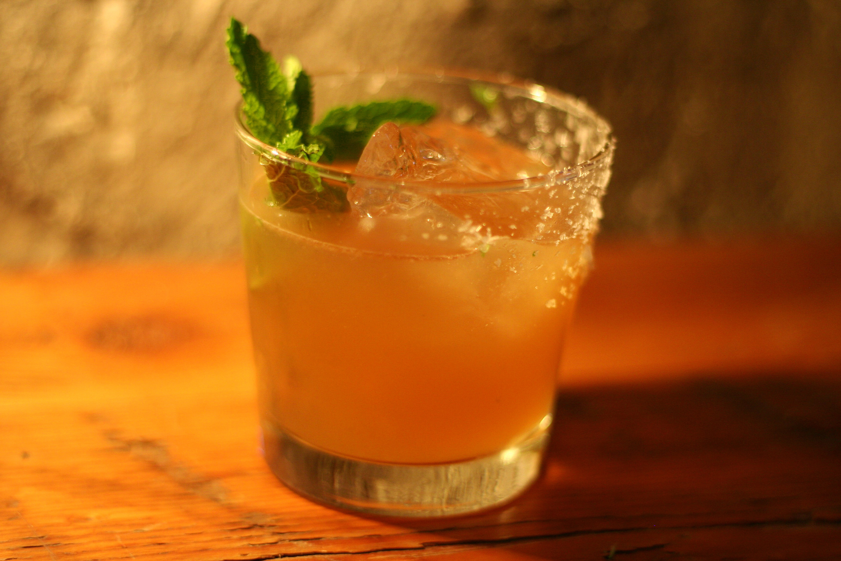 Descending downstairs into the “Underbelly” room, the first thing I noticed is the long, rough-hewn, wooden banquet table that is befitting a place called Wildebeest. It was elegantly lit with simple votive candles and lined with glasses of amber liquid that refracted the candlelight around the room giving it a warm, golden glow.