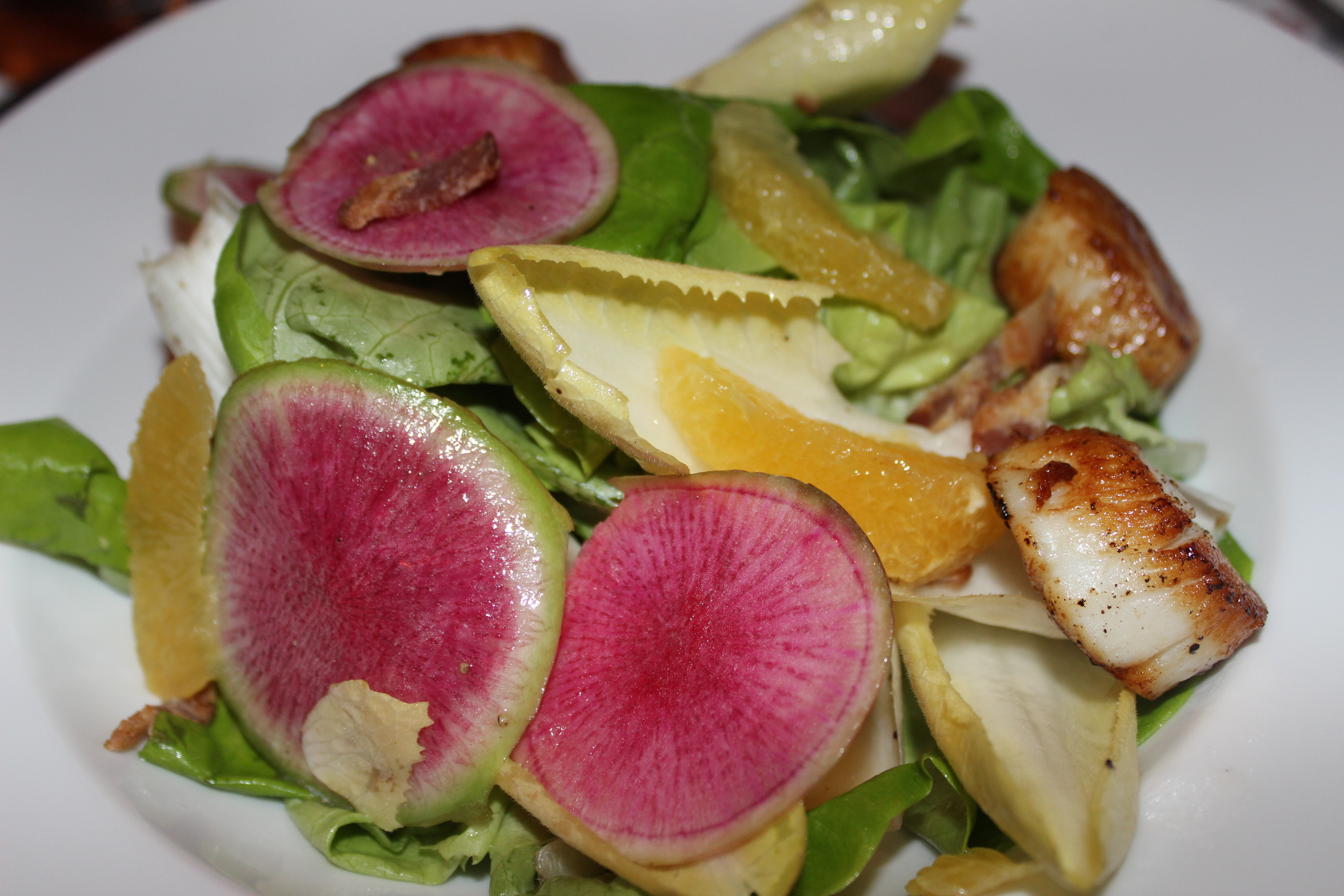 The favorite appetizer of the night for me was the colorful Scallop, Bacon and Endive Salad. Considering it had both scallops and bacon, it was already a hit before I tried it! However the presentation of the salad was beautiful, with the colors of orange, pecans, slices of radishes, butter lettuce accompanies well along with the freshly seared scallops and tossed in a light maple vinaigrette.
