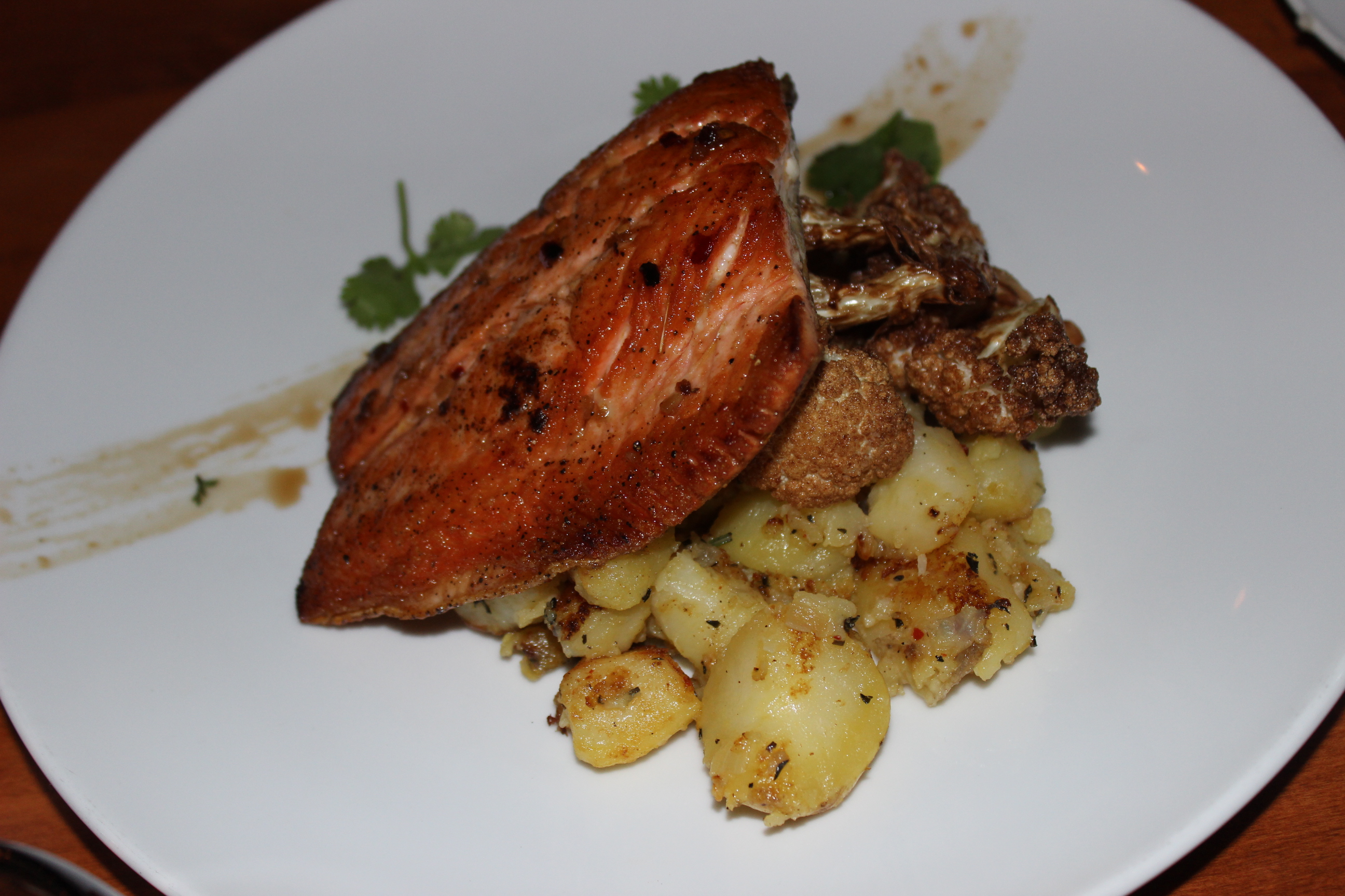 The final appetizer of the evening was the Maple and Bourbon Glazed Steelhead fish served with crushed olive oil roast potatoes and caramelized cauliflower. Nothing says West Coast like a crispy seared fish dish.