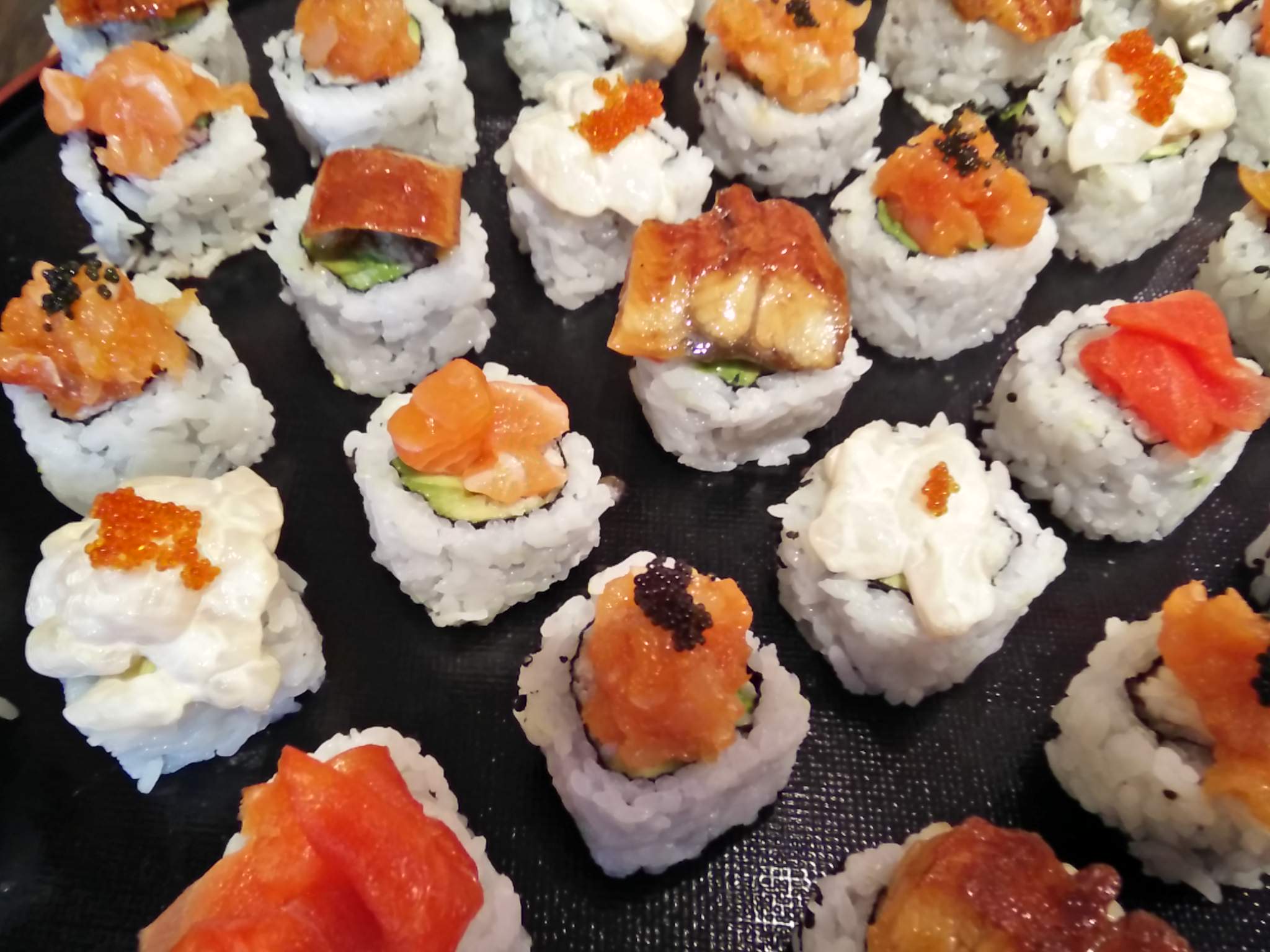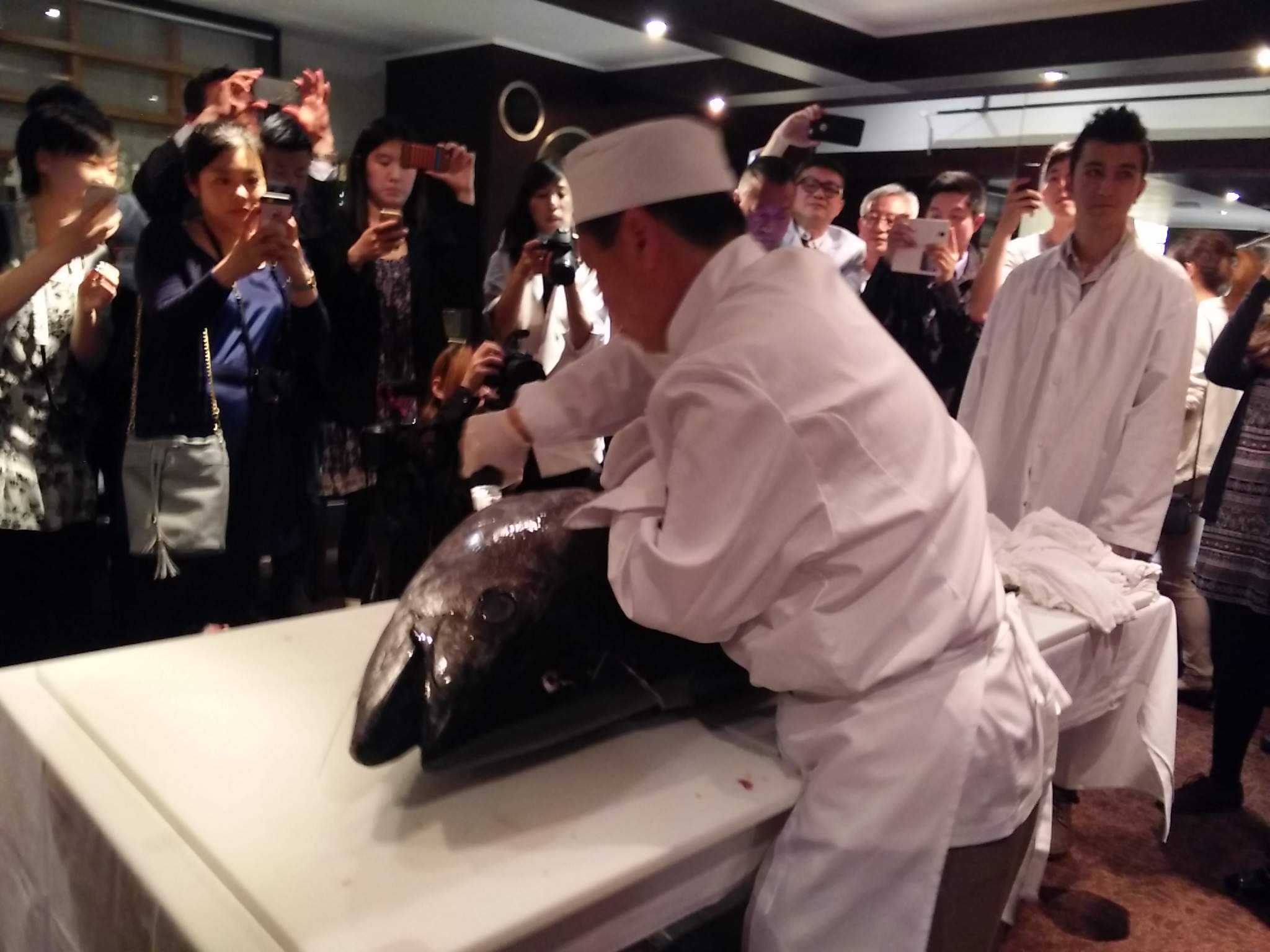 Servers and hosts were dressed up for the occasional – men in suits and ladies in traditional Japanese kimonos. Along with an opening speech, entertainment included taiko drumming, a Japanese lion dancing, a blue fin tuna cutting demo, and a traditional Japanese musical performance. We stayed for the blue fin tuna cutting demo – from my understanding the tuna was well over 100 lbs – that’s a lot of tuna!