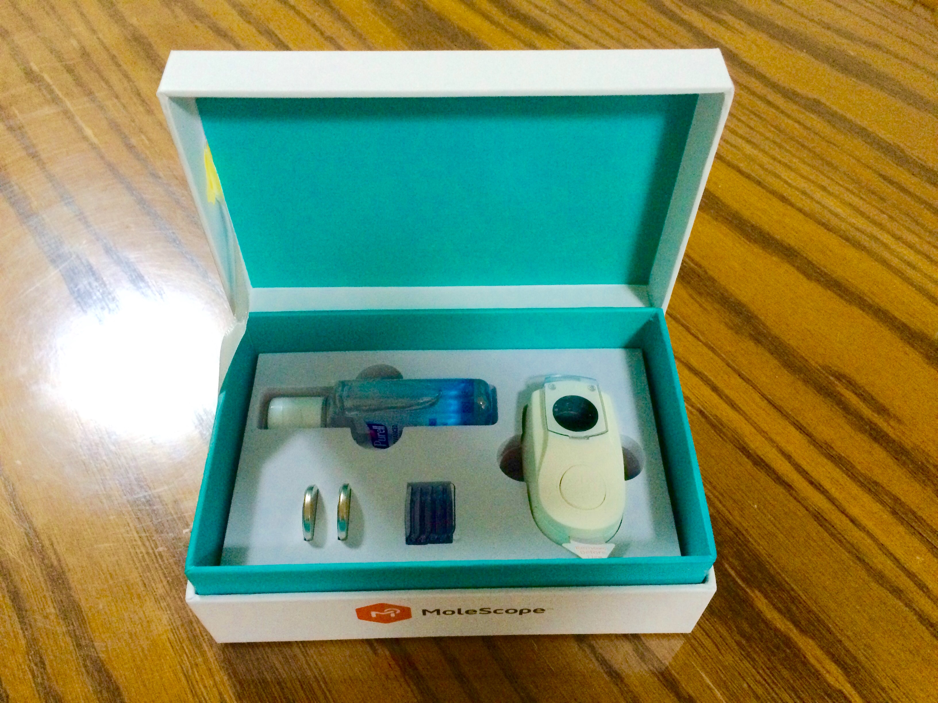 So with a great deal of expectation, I opened the shipping box containing the Molescope Basic device. Inside I found a methodically partitioned box containing the Molescope, along with an instruction manual, special antiseptic gel, two extra batteries, and five extra disposable contact pieces.