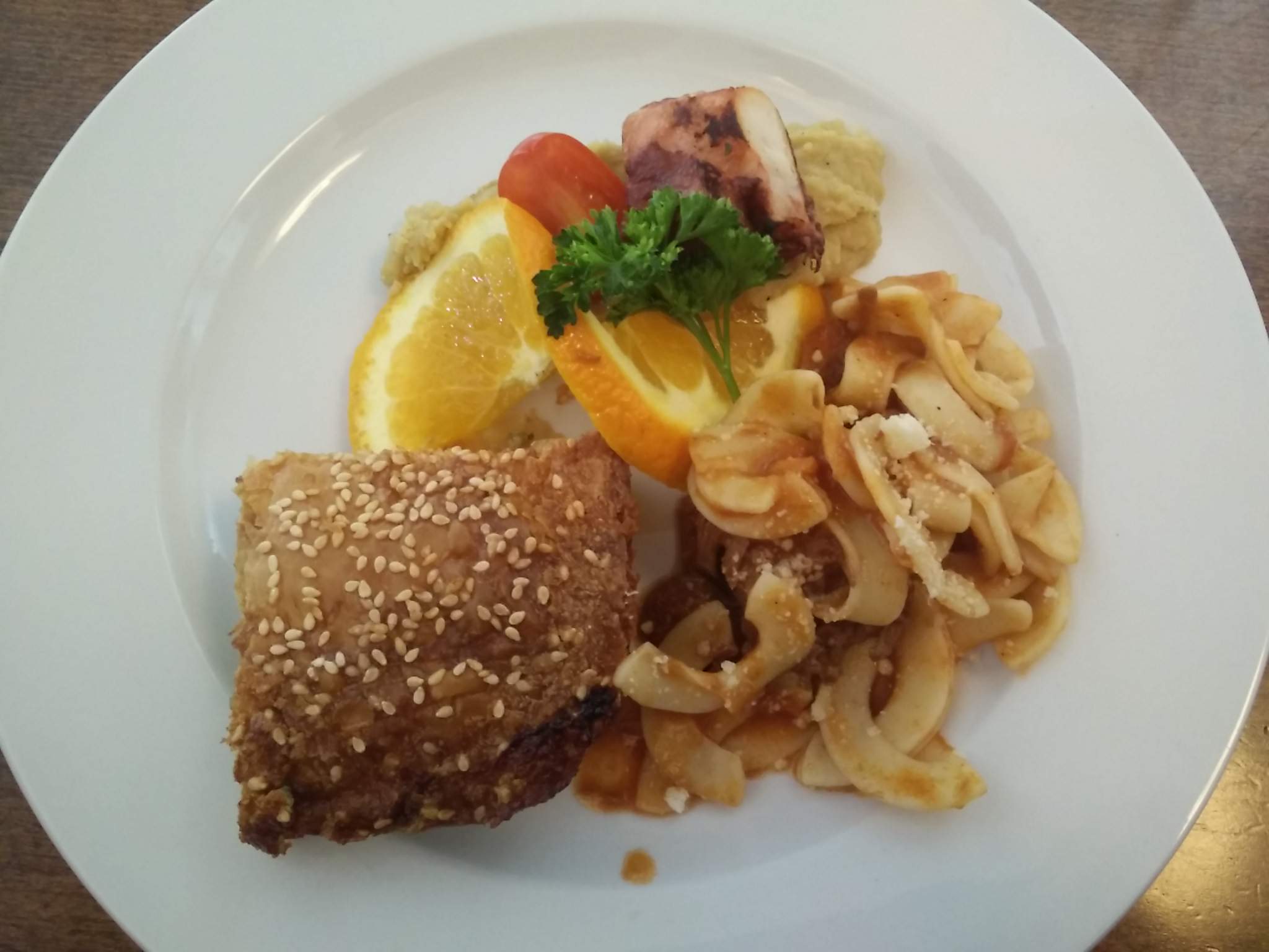 We then moved onto Nammos Estiatorio, where we were served a plate filled with Spanakotiropita, the Kokkinisto with Greek egg noodles and beef ragu, and the mushroom fava beans with grilled octopus! I found my Spanakotiropita lukewarm and a bit salty, however really enjoyed the Kokkinisto and the grilled octopus.