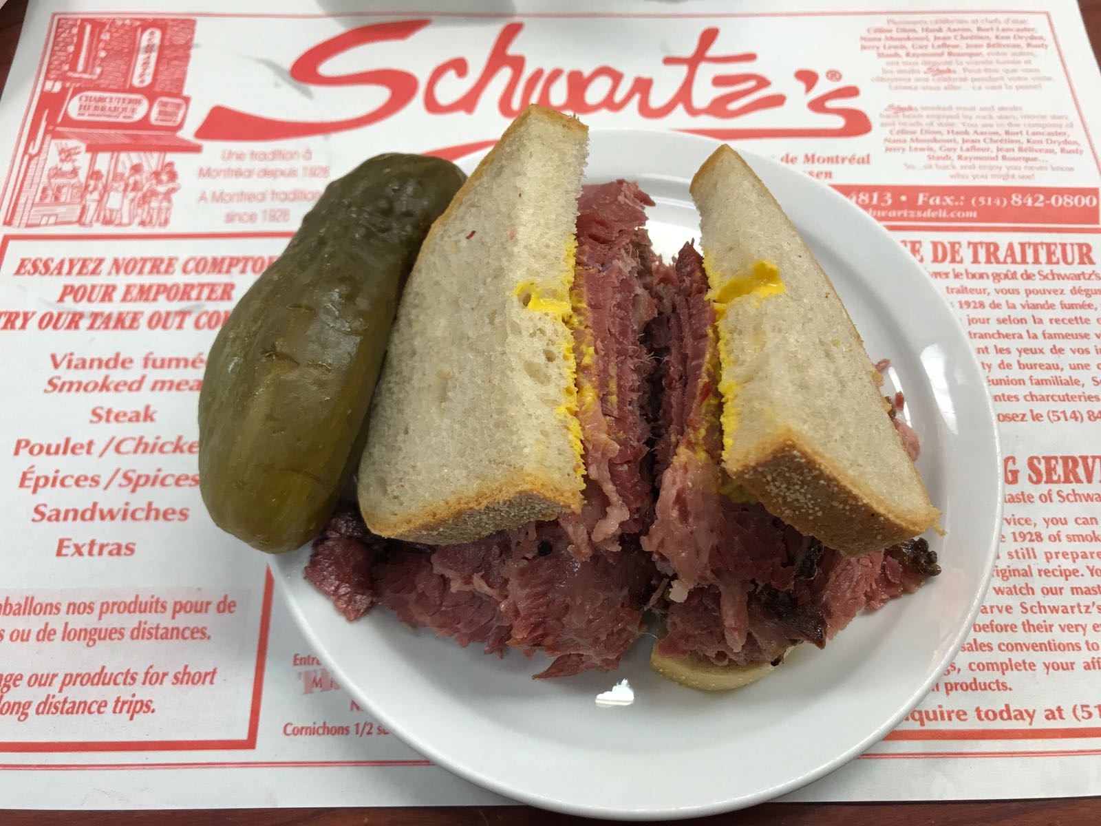 When it comes to smoked meat and Montreal, tourists and locals alike will mention Schwartz’s. This is one of the iconic delis that put smoked meat on the map. Locals will tell you its highly overrated, however tourists still flock to this famous Hebrew deli, partially owned by famous singer Celine Dion. Here I sat at the bar, thinking of famous celebrities who might also have sat in my seat. The server was nice and friendly, suggesting to order the smoked meat sandwich and mentioning sides are extra. The friendly tourists sitting next to me commented on how large the sandwich was and hope that I came hungry. I wasn’t, however wanted to try this mouthwatering sandwich. It was fattier than my previous sandwich at Smoking Meat, however super juicy and tender. The deli pickle I ordered on the side complimented the sandwich – highly recommend you order this with the sandwich.